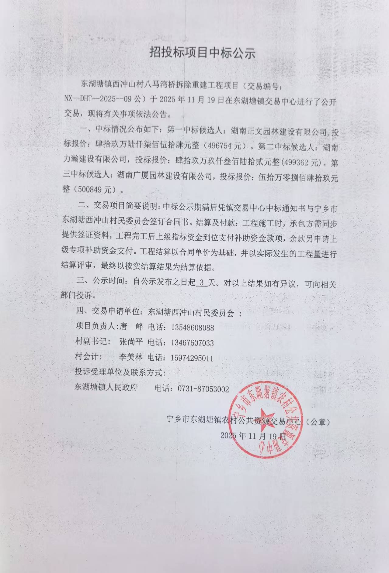 東湖塘鎮西沖山村八馬灣橋拆除重建工程項目中標公示
