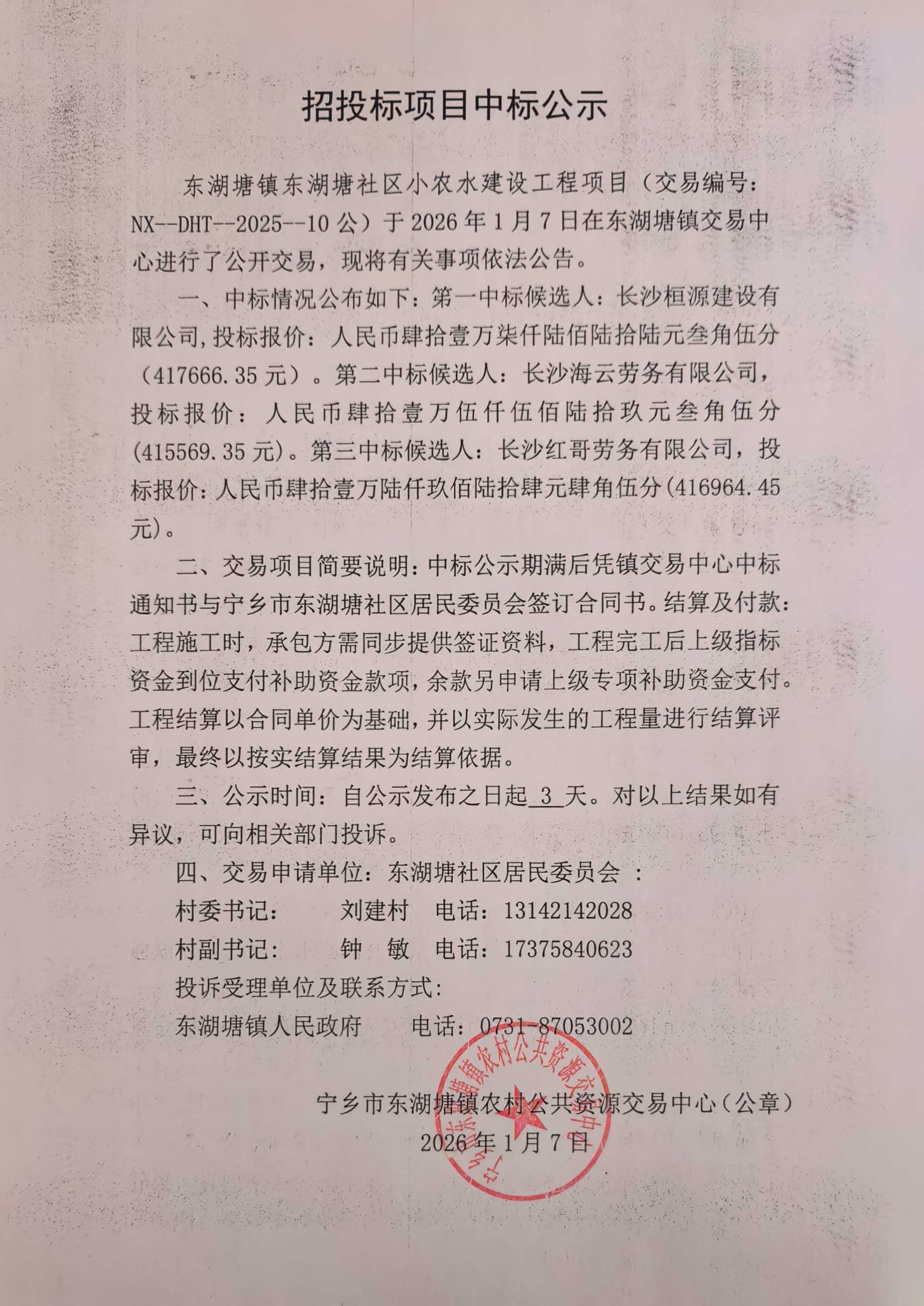 寧鄉市東湖塘鎮社區小農水建設工程項目中標公示