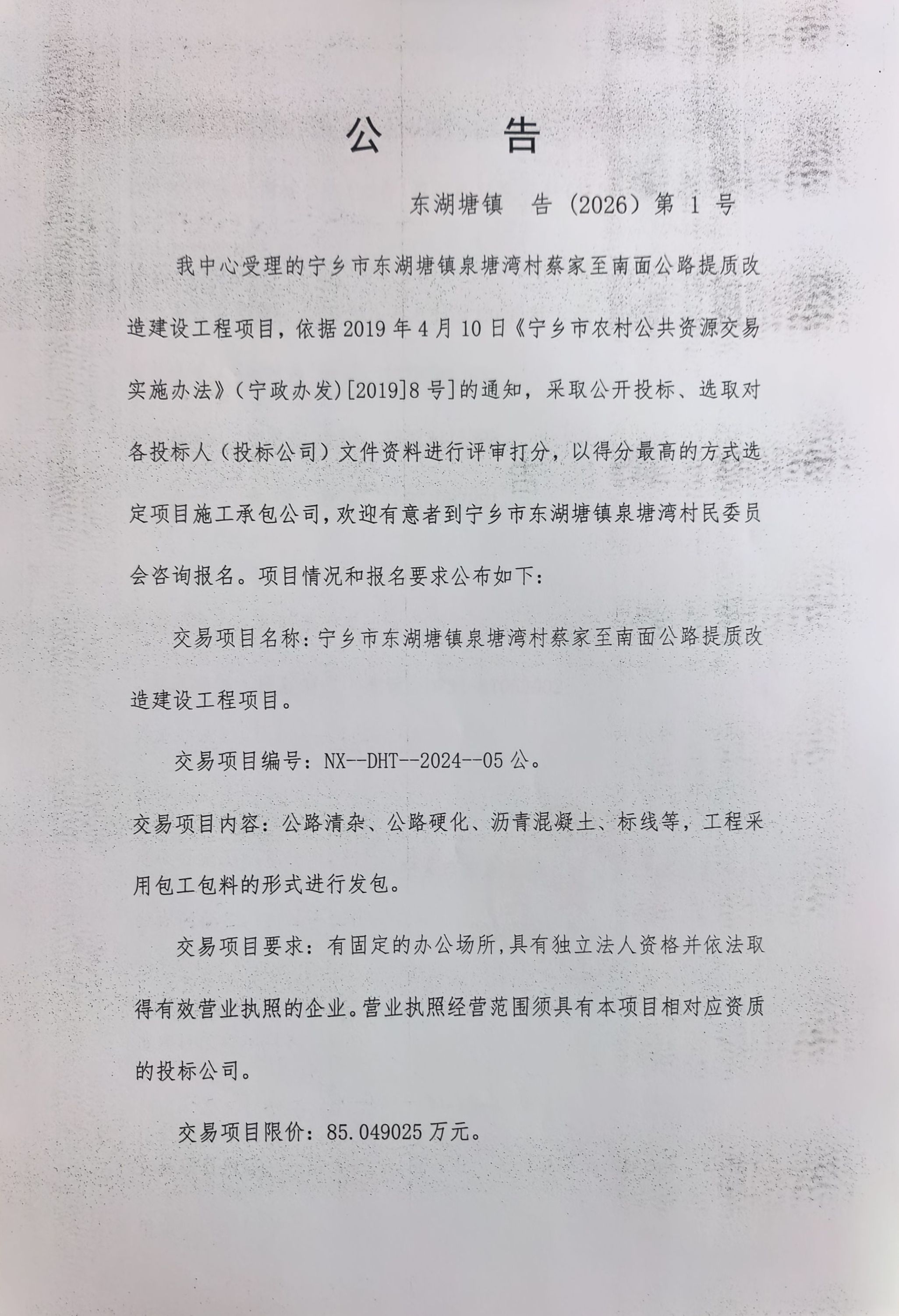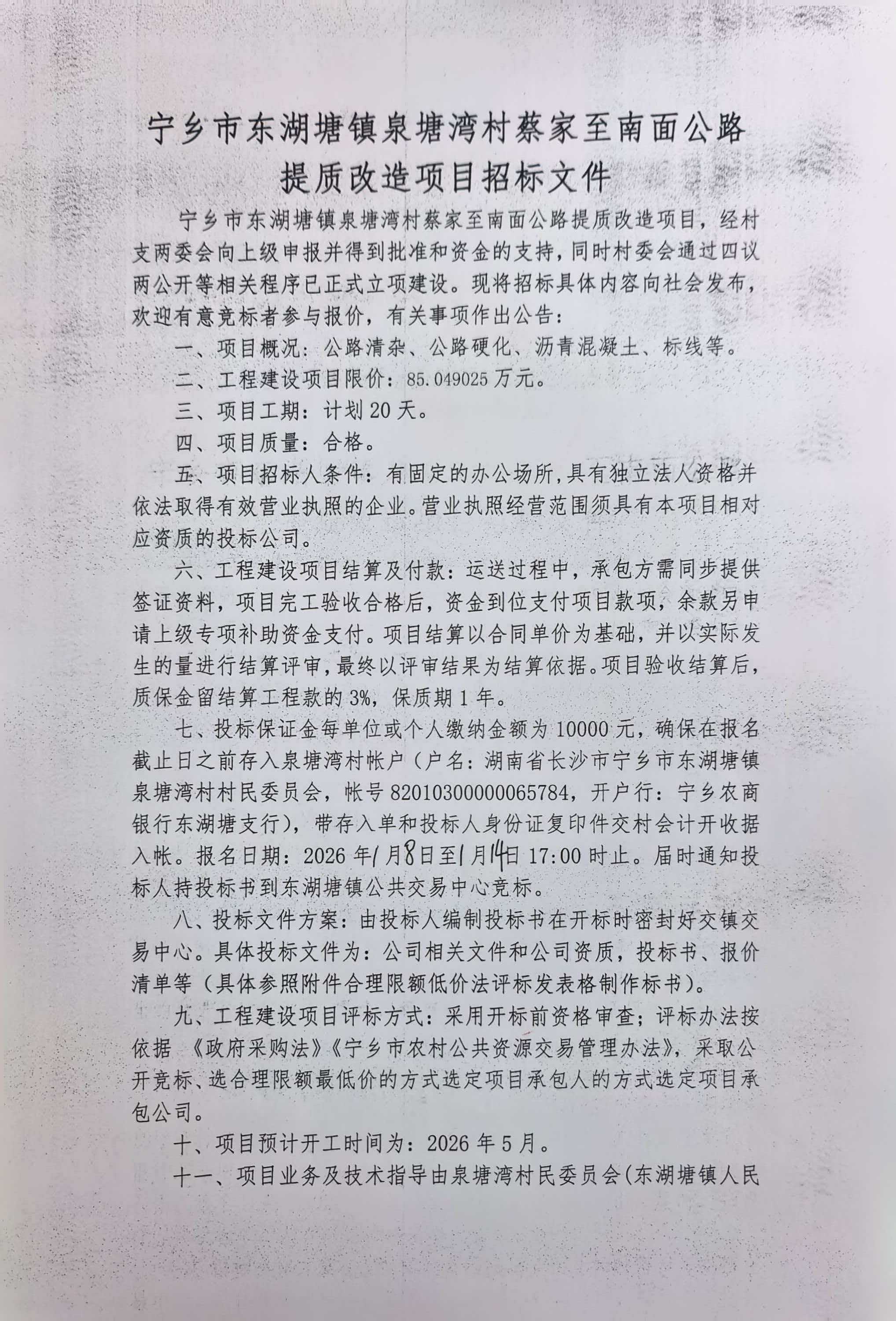 寧鄉(xiāng)市東湖塘鎮(zhèn)泉塘灣村蔡家至南面公路提質改造項目招標文件