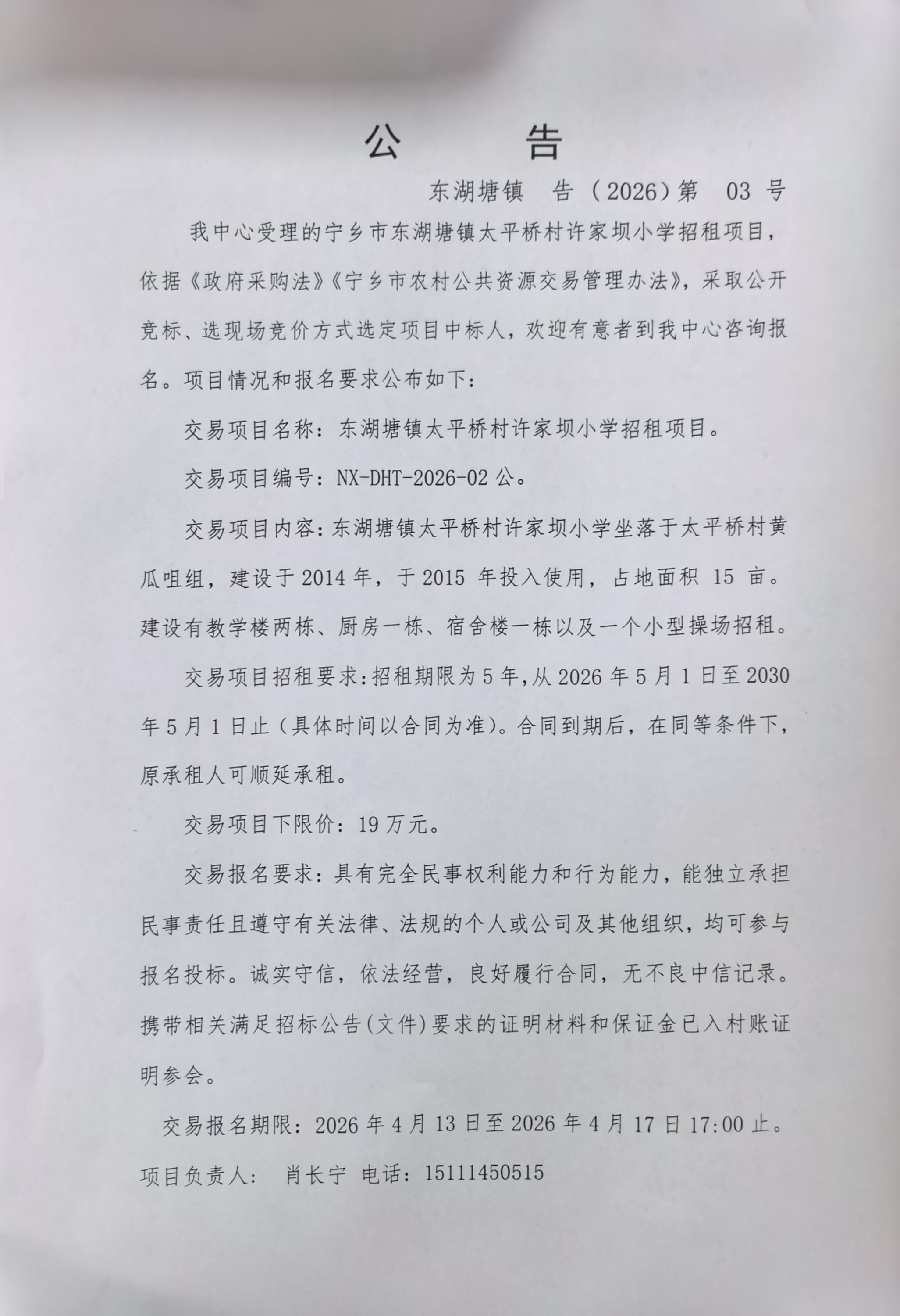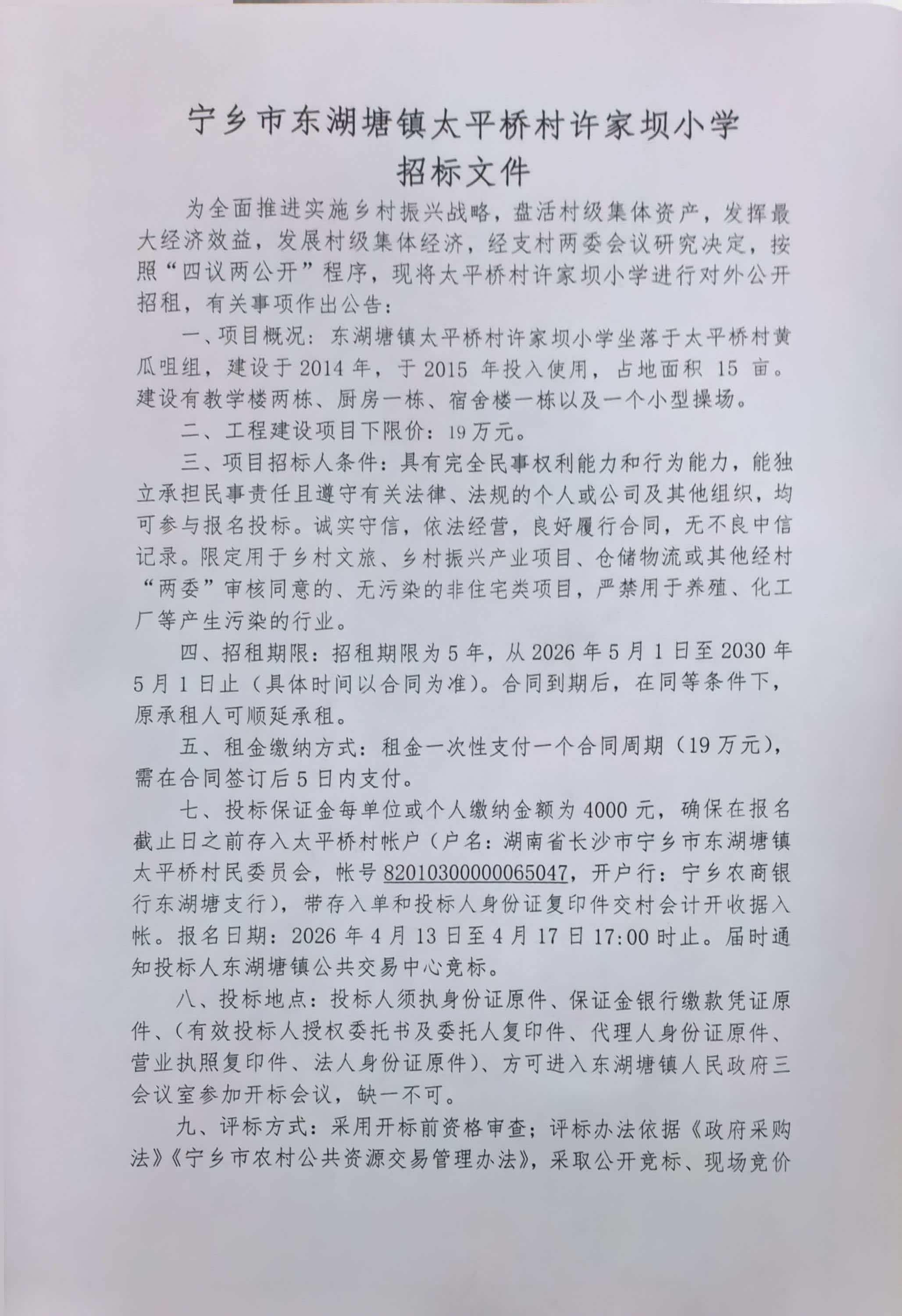 寧鄉市東湖塘鎮太平橋村許家壩小學招租招標文件