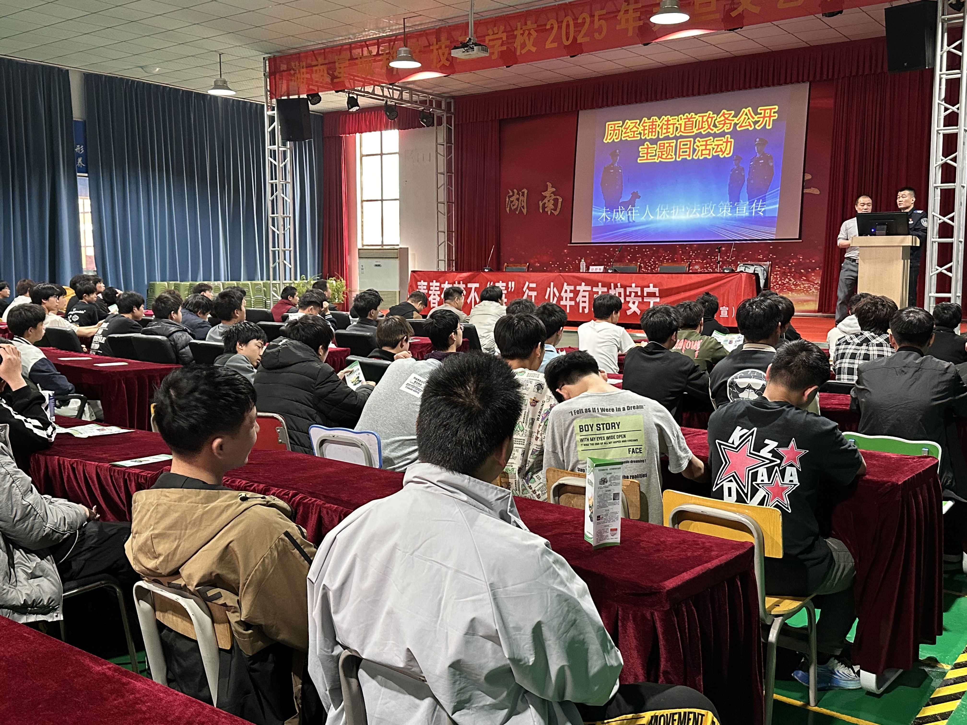 本次活動(dòng)以“學(xué)法明是非、守法護(hù)成長(zhǎng)、拒毒護(hù)青春—未成年人保護(hù)法政策宣傳”為主題,由歷經(jīng)鋪街道主辦,歷經(jīng)鋪派出所、湖南星城科技技工學(xué)校協(xié)辦。在大灣嶺社區(qū)星城職業(yè)技術(shù)學(xué)校舉行,覆蓋師生500余人。街道成立了統(tǒng)籌組、策劃組、安保組,分工負(fù)責(zé)會(huì)務(wù)保障、場(chǎng)地布置、安全防范、應(yīng)急處置等工作,確保活動(dòng)規(guī)范有序、安全順暢開(kāi)展。