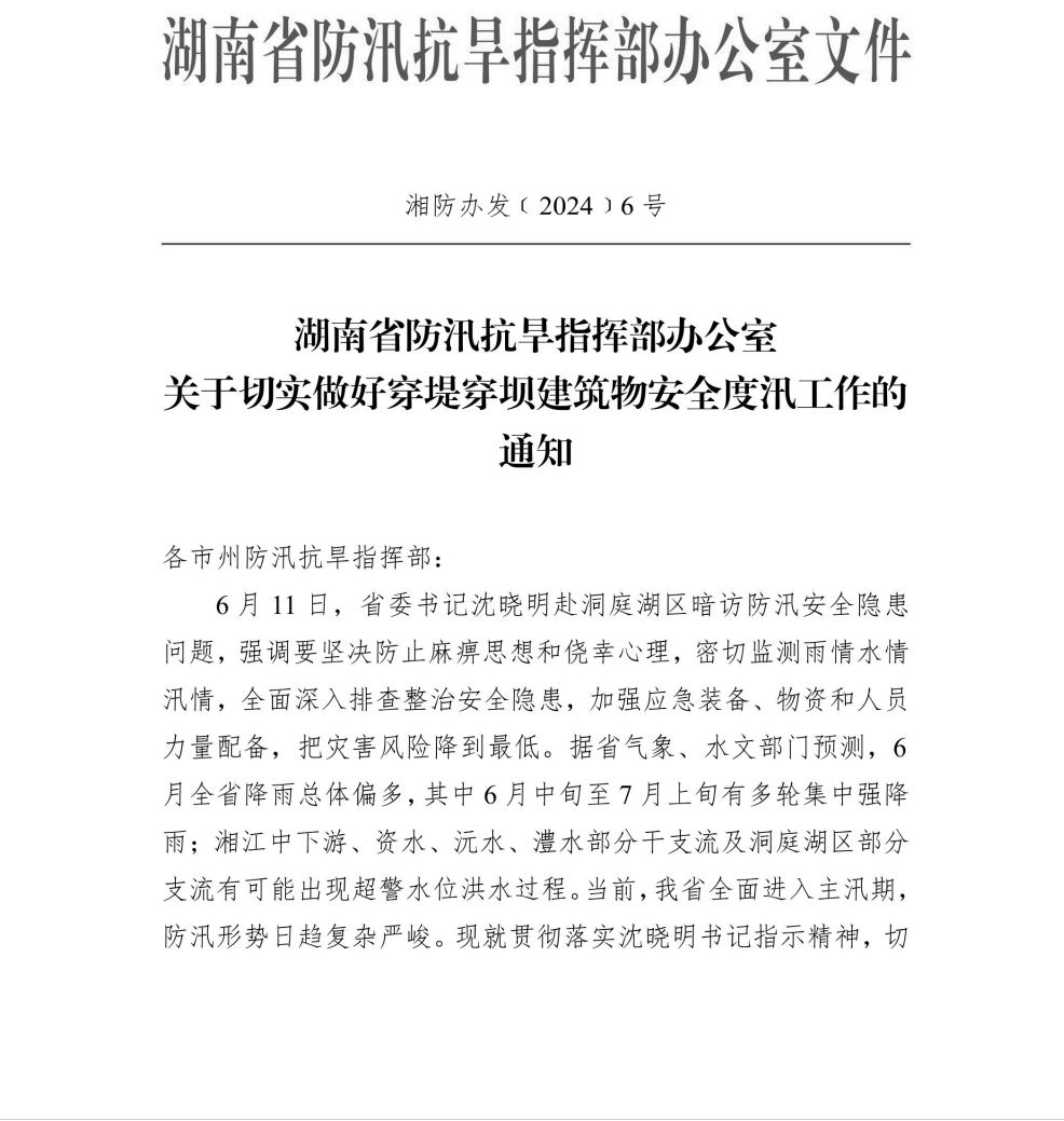附件:湖南省防汛抗旱指揮部辦公室《關于切實做好穿堤穿壩建筑物安全度汛工作的通知》。