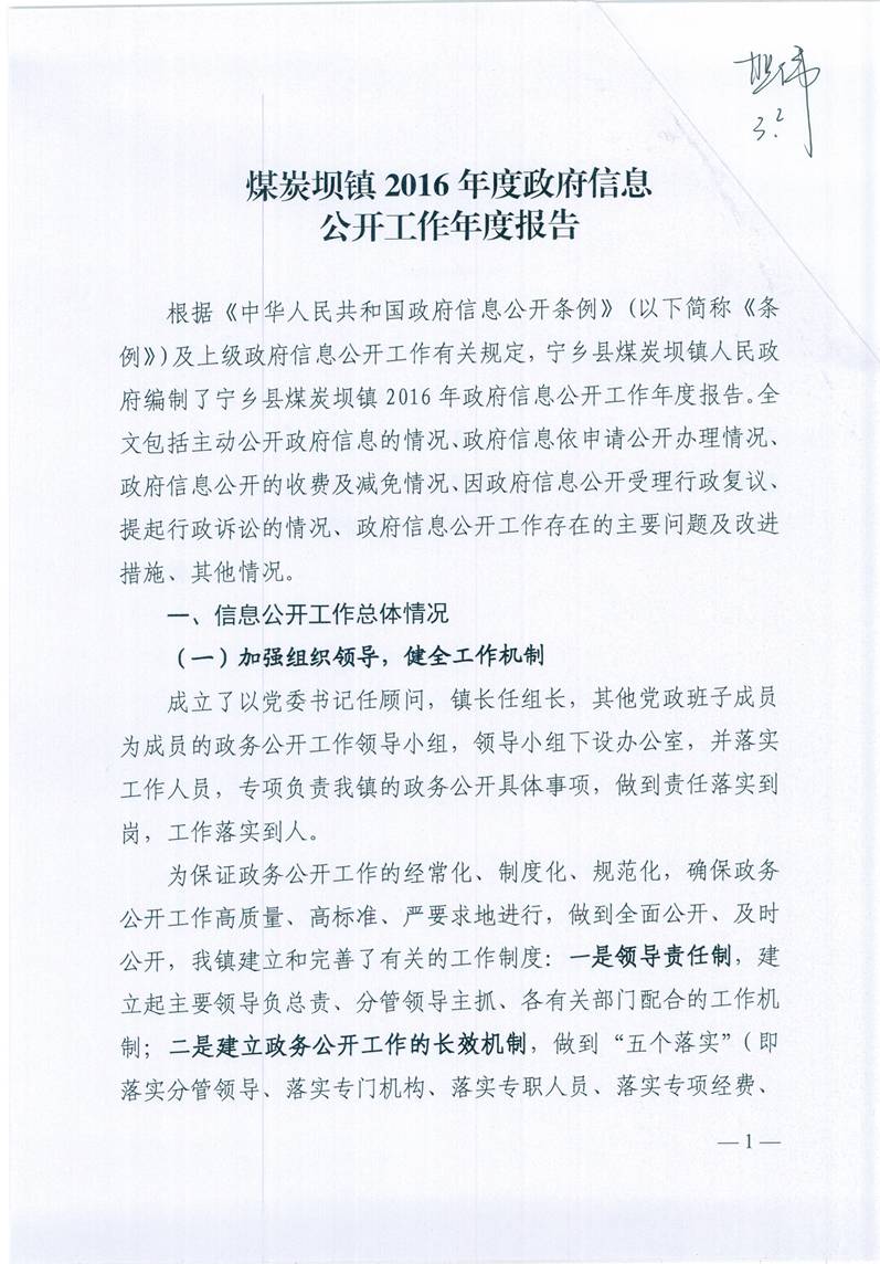 寧鄉市煤炭壩鎮人民政府2016年政府信息公開工作年度報告