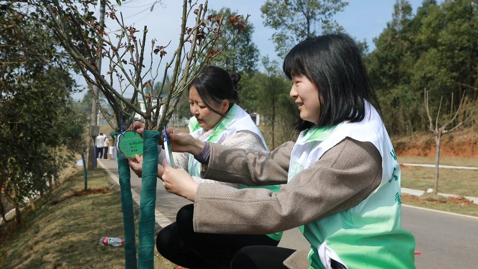 “希望小樹和我一起茁壯成長!”“枝繁葉茂,花開滿園!”植樹結束后,大家紛紛在自己栽種的樹苗上掛上銘牌,寫下美好寄語。一名來自商會的志愿者輕撫著剛剛培好土的樹苗說:“今天種下的不僅是樹,更是對家鄉生態的美好期盼。等花開時節,這里一定會成為游客打卡的好地方。”