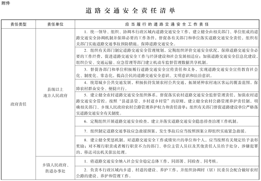 各級人民政府主要負責人是本行政區域道路交通安全的第一責任人,對道路交通安全工作承擔全面領導責任;分管道路交通安全的負責人對道路交通安全工作承擔重要領導責任;其他負責人對分管范圍內的道路交通安全工作承擔直接領導責任。