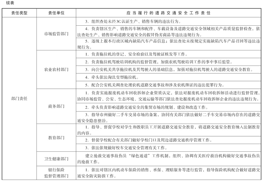 公安、交通運輸、應急管理、住房和城鄉建設、市場監管、農業農村、商務、教育、衛生健康、文化和旅游、氣象等部門,應當在道路交通安全工作中履行相應的監管職責。
