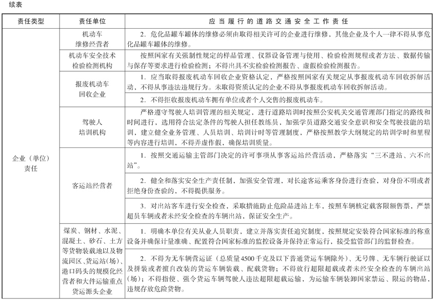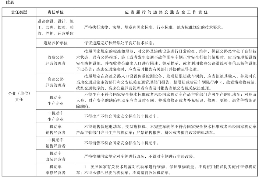 道路建設、設計、施工、監理、檢測、驗收、養護、運營單位,車輛所有和管理單位,車輛生產、銷售、改裝、維修、報廢回收單位,機動車安全技術檢驗機構,機動車駕駛人培訓、考試單位,客危貨運輸企業、貨運源頭單位以及其他相關企業和單位,應當履行相應的道路交通安全管理職責和義務。