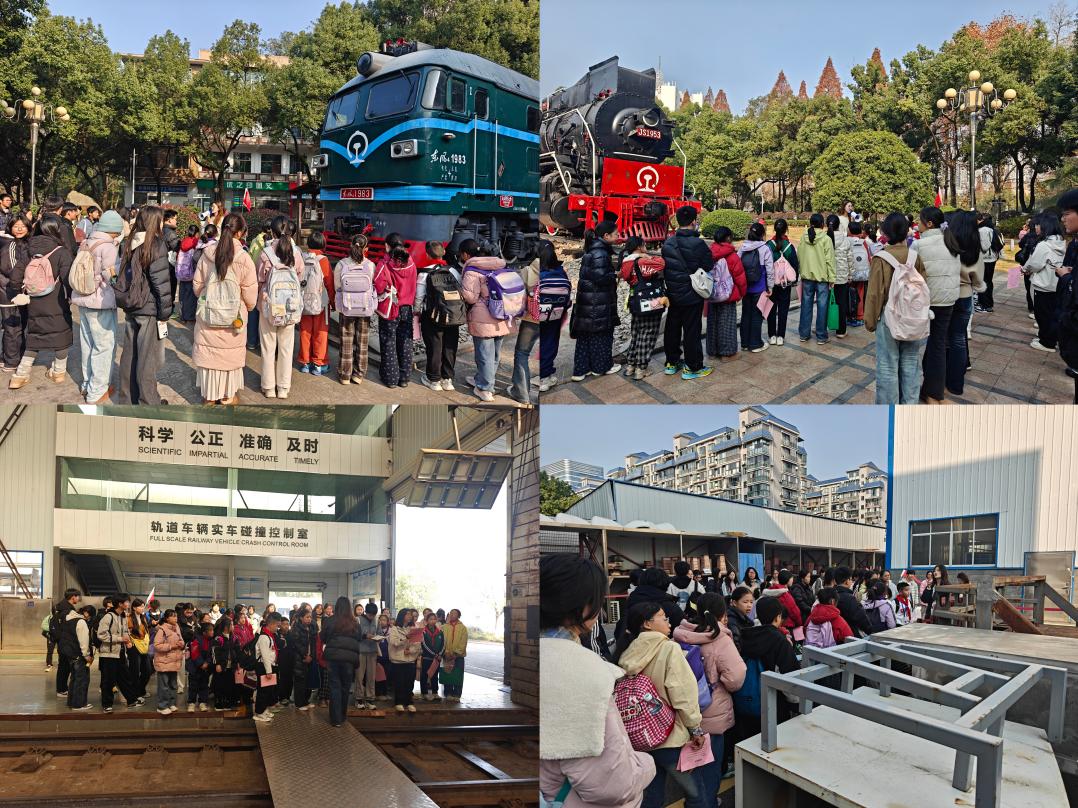 當天上午,中小學研學隊伍首站抵達中南大學天心校區,開展“科學之旅”。同學們在專業講解員的引導下,依次參觀鐵路園、碰撞實驗室與氣動實驗室,近距離觀摩氣動和碰撞實驗場地并觀看鐵路科技展品,系統學習了鐵路發展歷程與相關物理原理,親身感受科學技術的魅力。