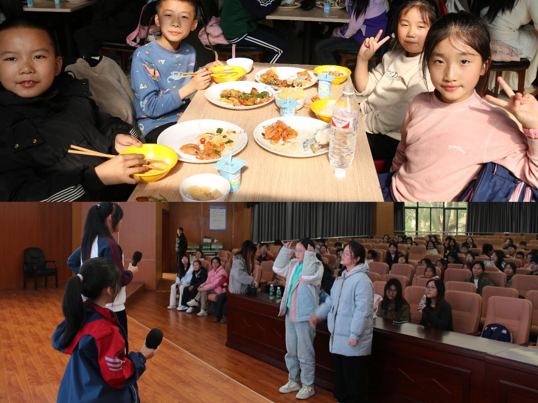 隨后,大中小學師生集體前往天心校區六食堂用餐,并在梅園報告廳稍作休整。期間,大學生志愿者與中、小學學生開展“你來比劃我來猜”的趣味互動游戲以及才藝表演,通過輕松的團體游戲,拉近了彼此距離,現場氣氛活躍融洽。
