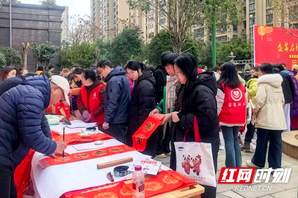 活動現場設置便民服務、文藝展演、趣味互動、榮譽表彰四大板塊。“翰墨送福”專區墨香四溢,書法愛好者們凝神運筆、揮毫潑墨,筆尖起落間,行書、楷書、隸書等多種字體的春聯一氣呵成,居民們圍在桌前挑選心儀的春聯,臉上洋溢著藏不住的笑意。
