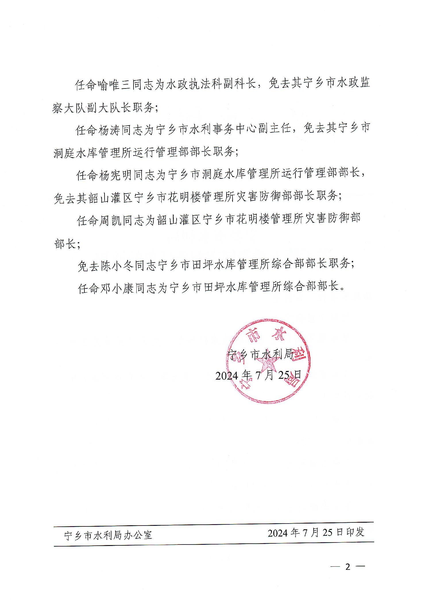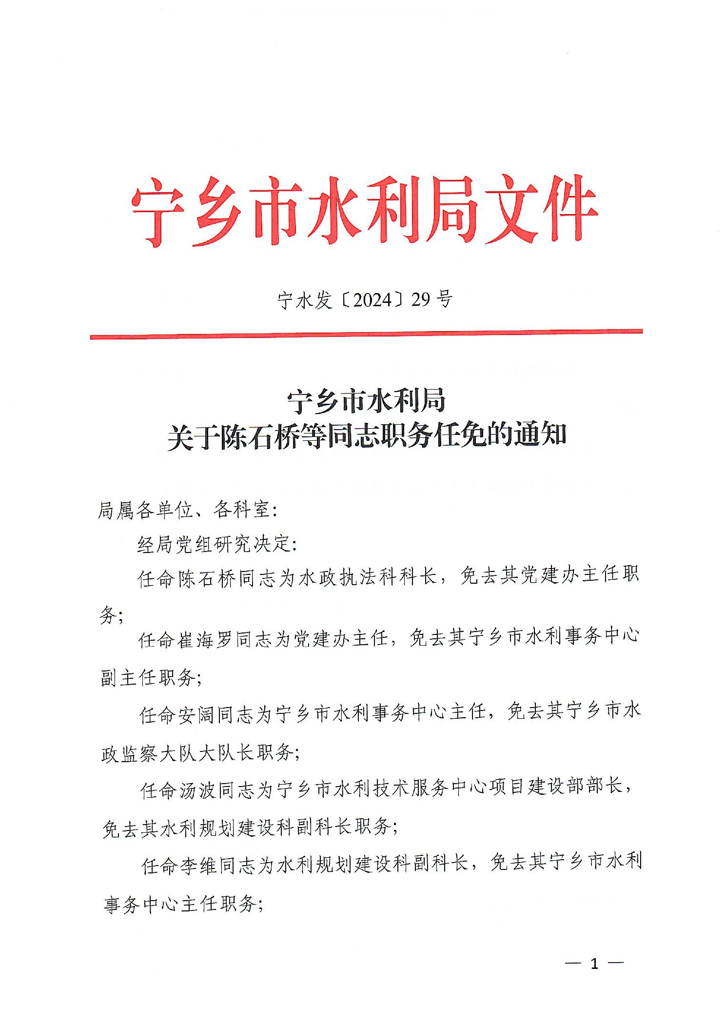 寧鄉(xiāng)市水利局關(guān)于陳石橋等同志職務(wù)任免的通知