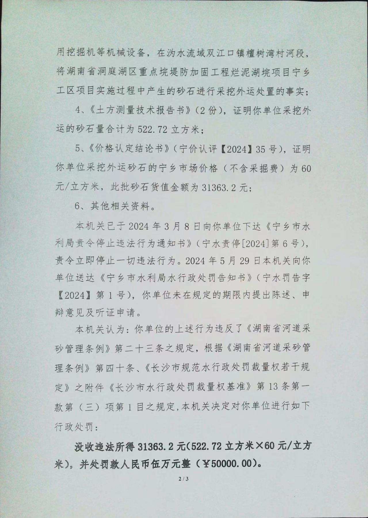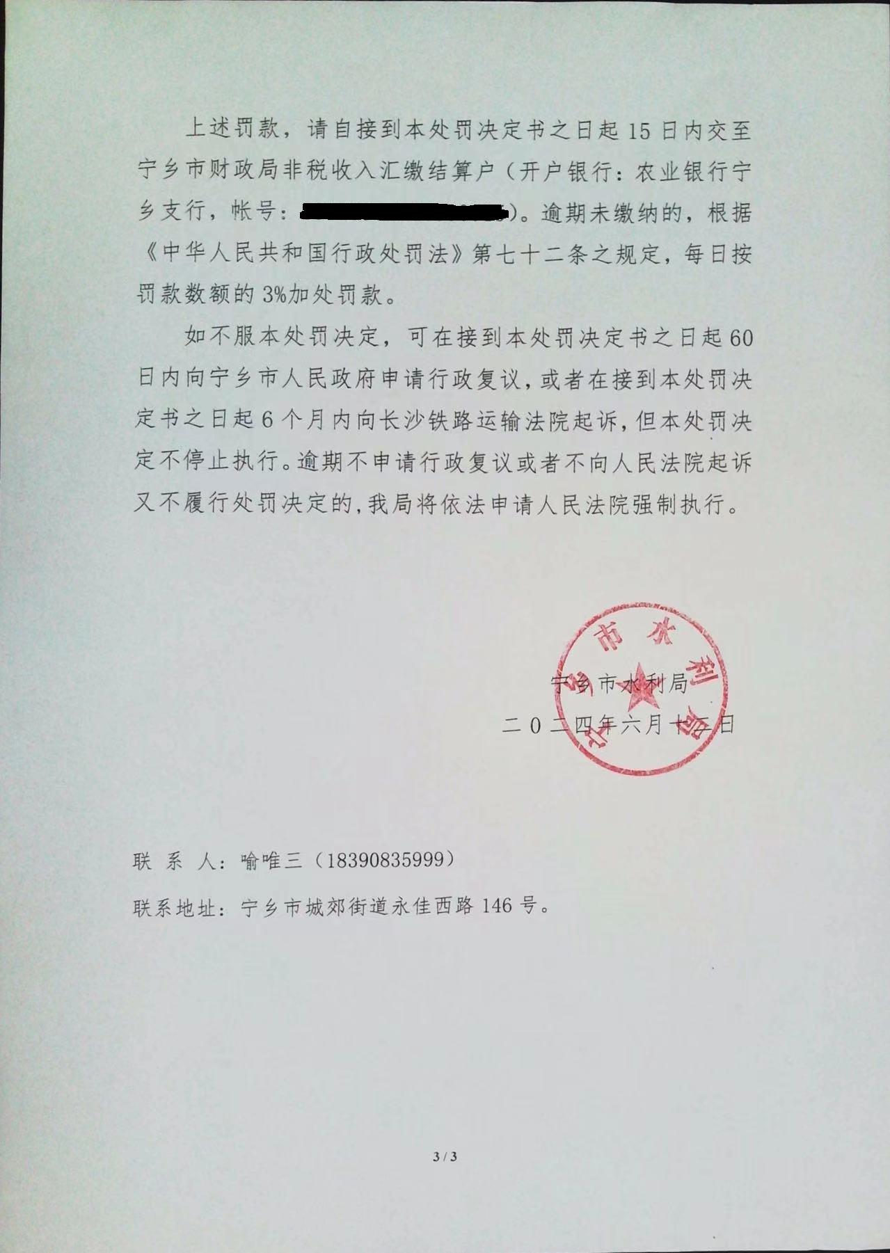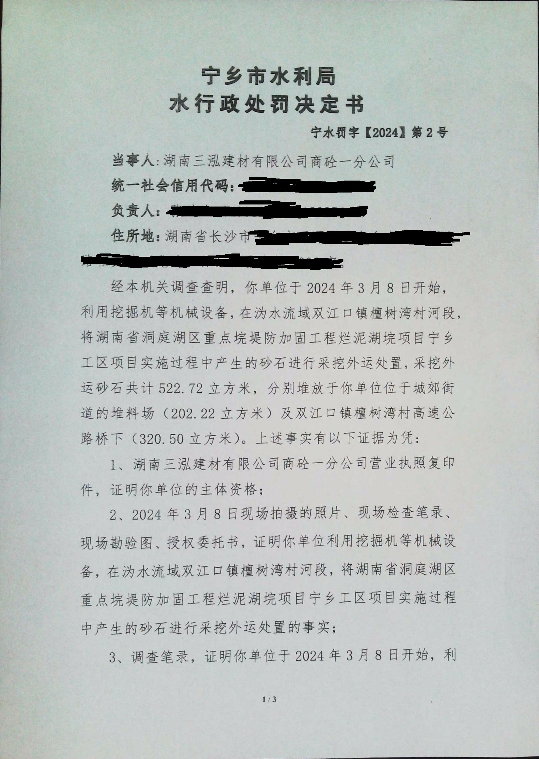 寧鄉市水利局對湖南三泓建材有限公司商砼一分公司的行政處罰
