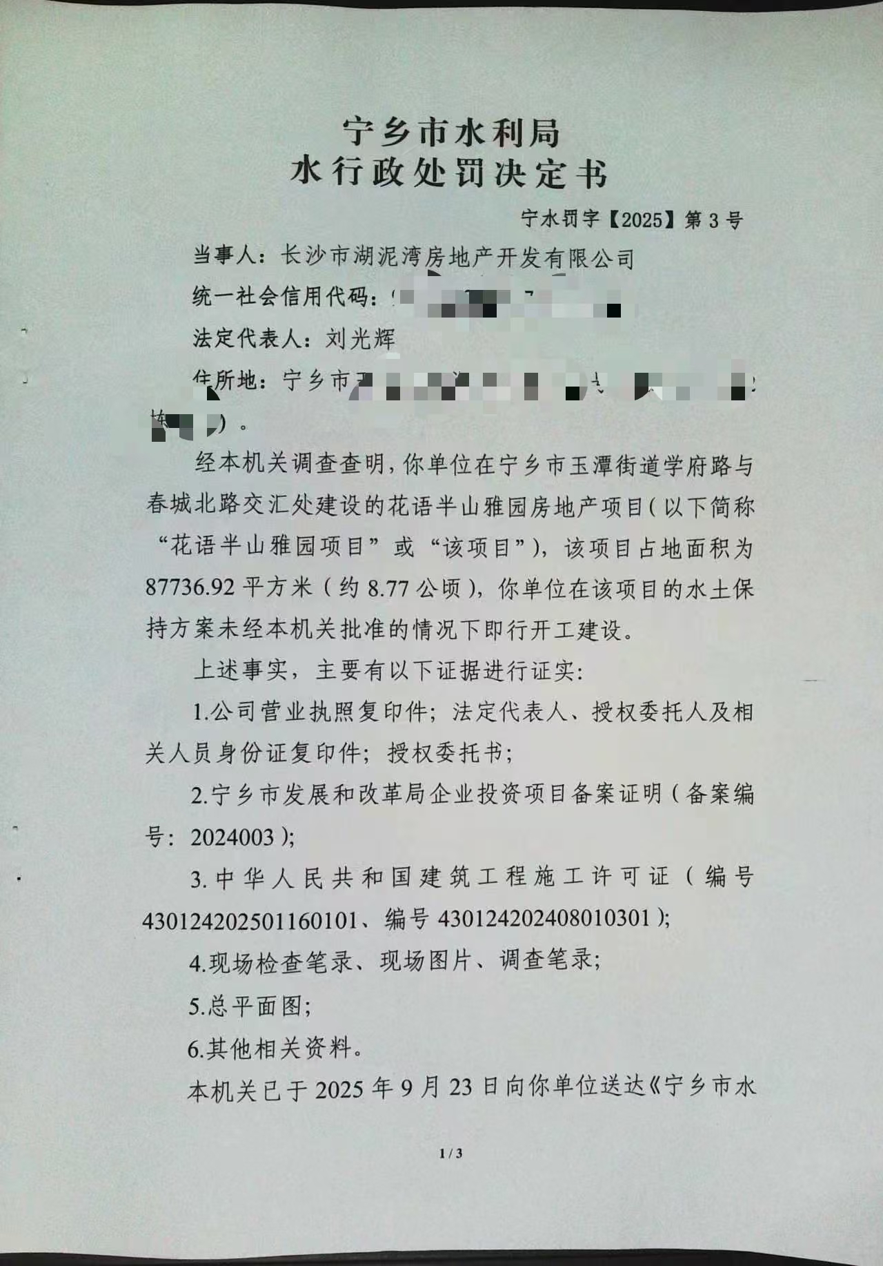 寧鄉市水利局對長沙市湖泥灣房地產開發有限公司的行政處罰
