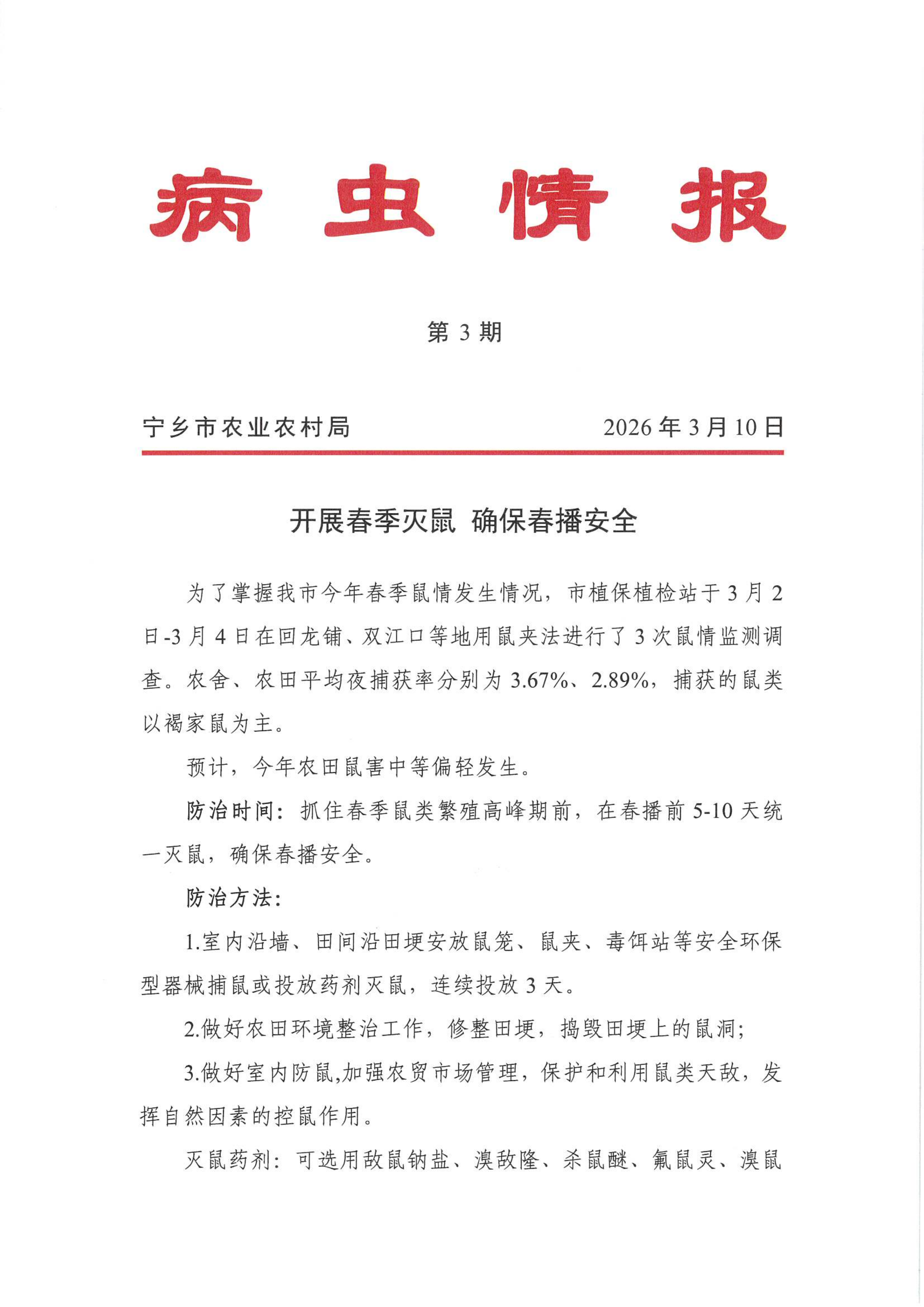 寧鄉(xiāng)市2026年病蟲(chóng)情報(bào)第3期:開(kāi)展春季滅鼠確保春播安全