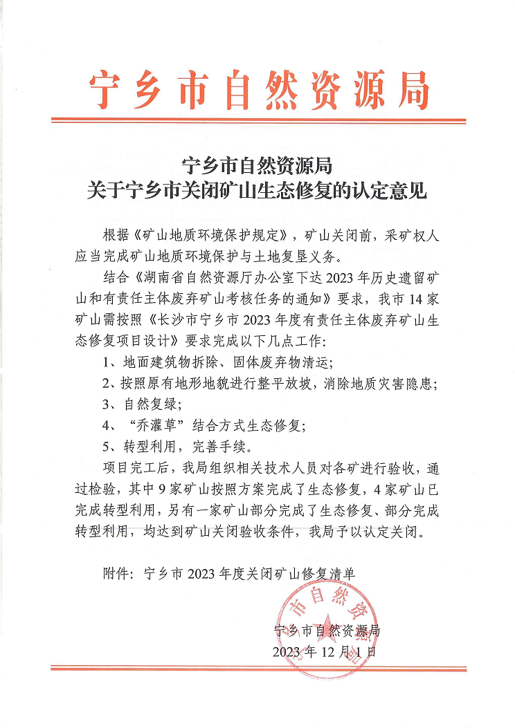 寧鄉市自然資源局關于寧鄉市關閉礦山生態修復的認定意見