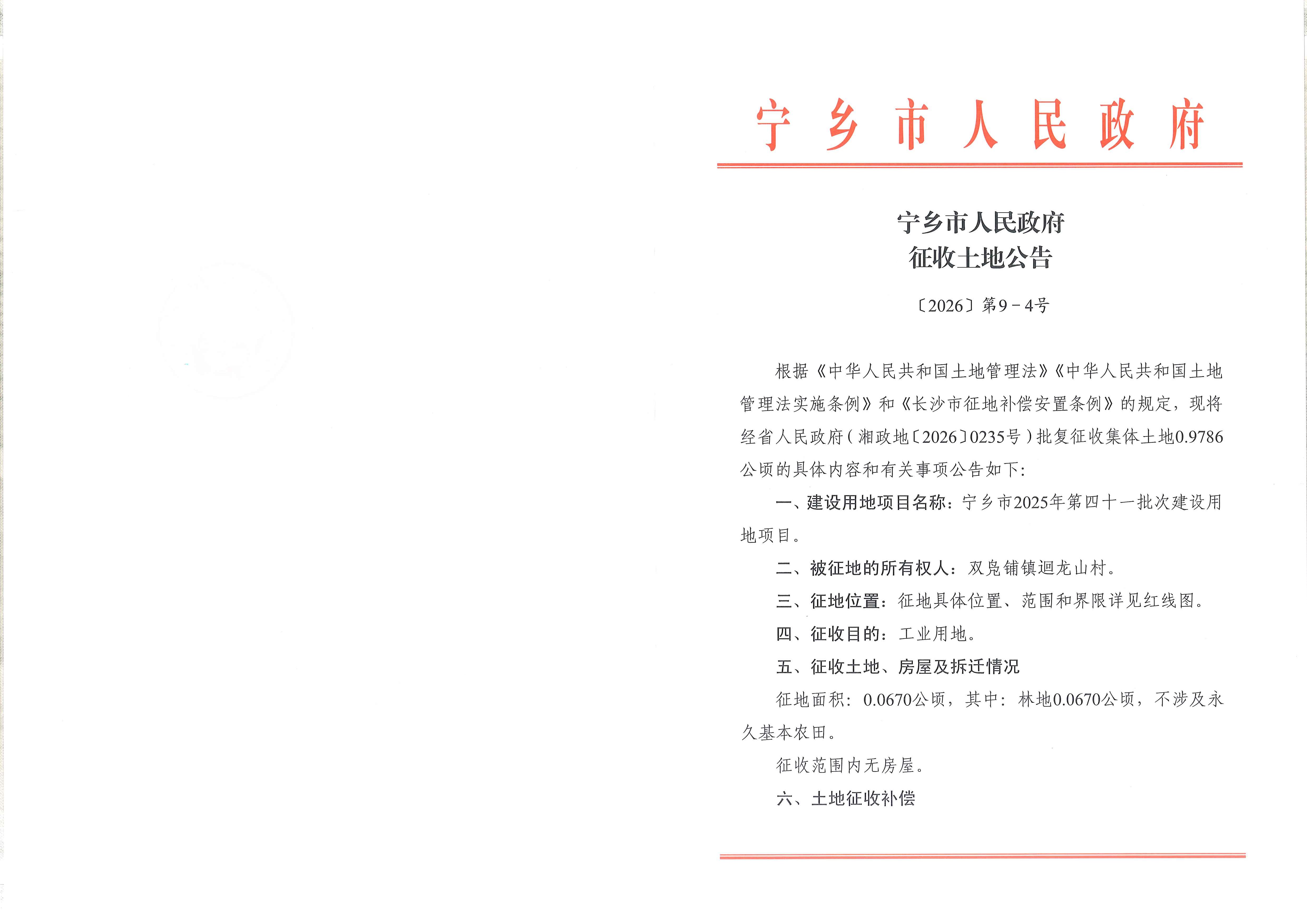 寧鄉市人民政府征收土地公告〔2026〕第9-4號