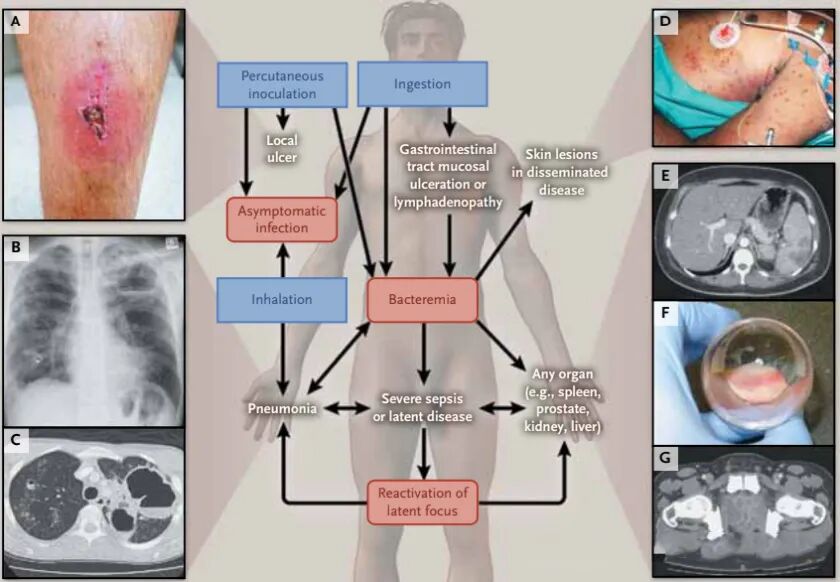 ★ 它通過(guò)與受污染的水和土壤直接接觸傳播給人類(lèi)和動(dòng)物。臨床表現(xiàn)包括肺炎、敗血癥和各種器官的局灶性感染。
