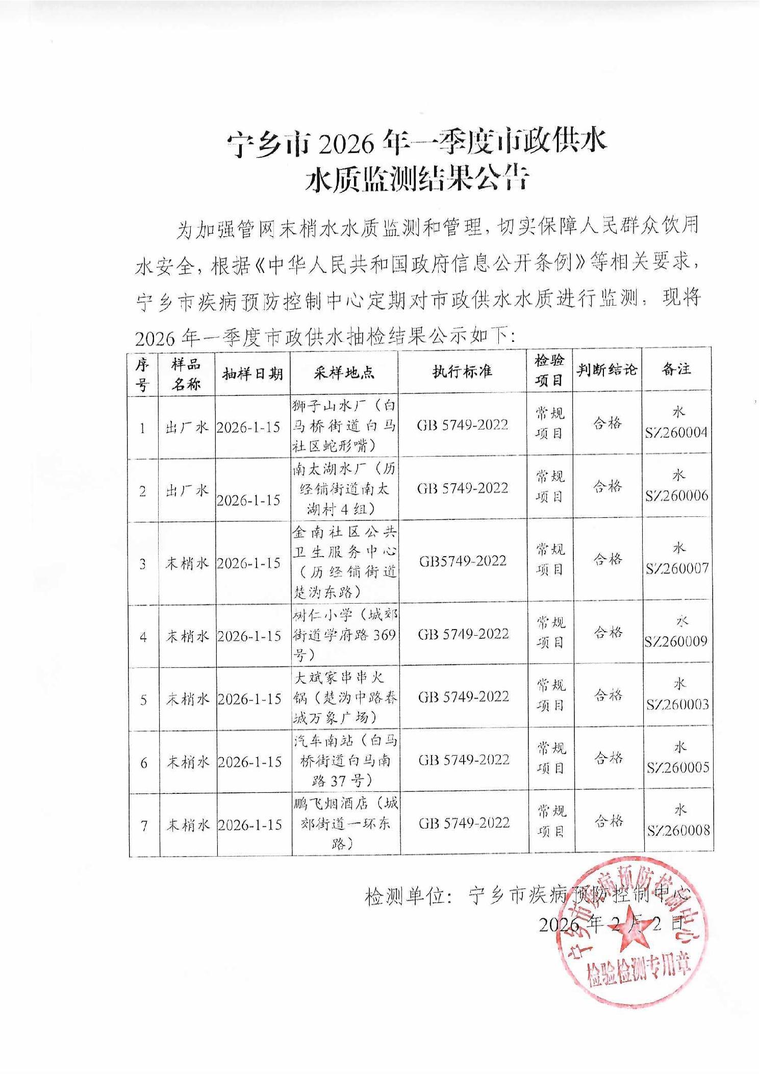 寧鄉市2026年一季度市政供水水質監測結果公告