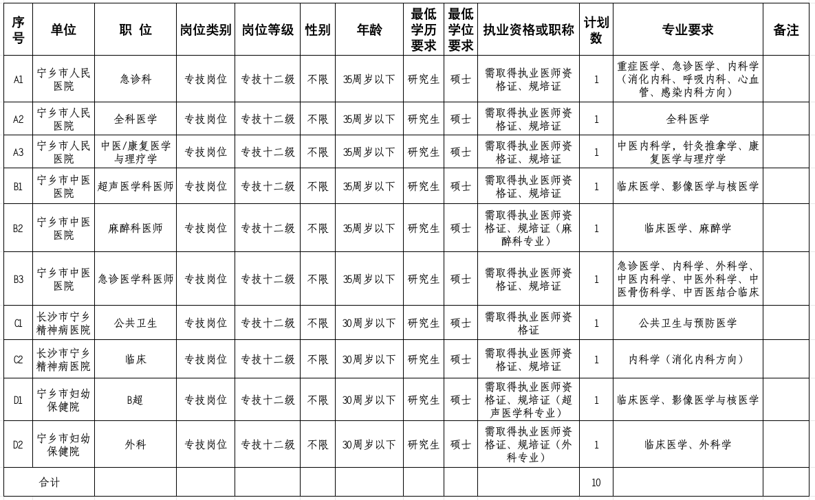 1.本次招聘專業技術人員共計10名,具體招聘單位、招聘崗位、招聘人數、崗位所需的學歷、學位、專業要求及相關資格條件見《2025年寧鄉市基層衛生專業技術人員“縣聘鄉用”專項招聘崗位計劃表》(附件1,以下簡稱《計劃表》)。