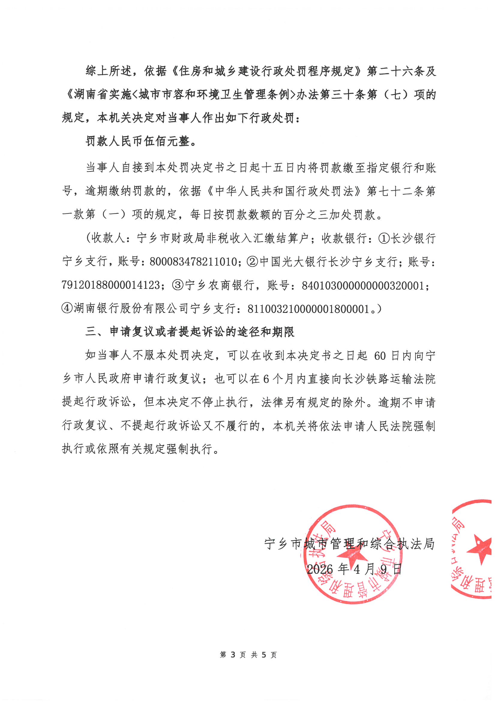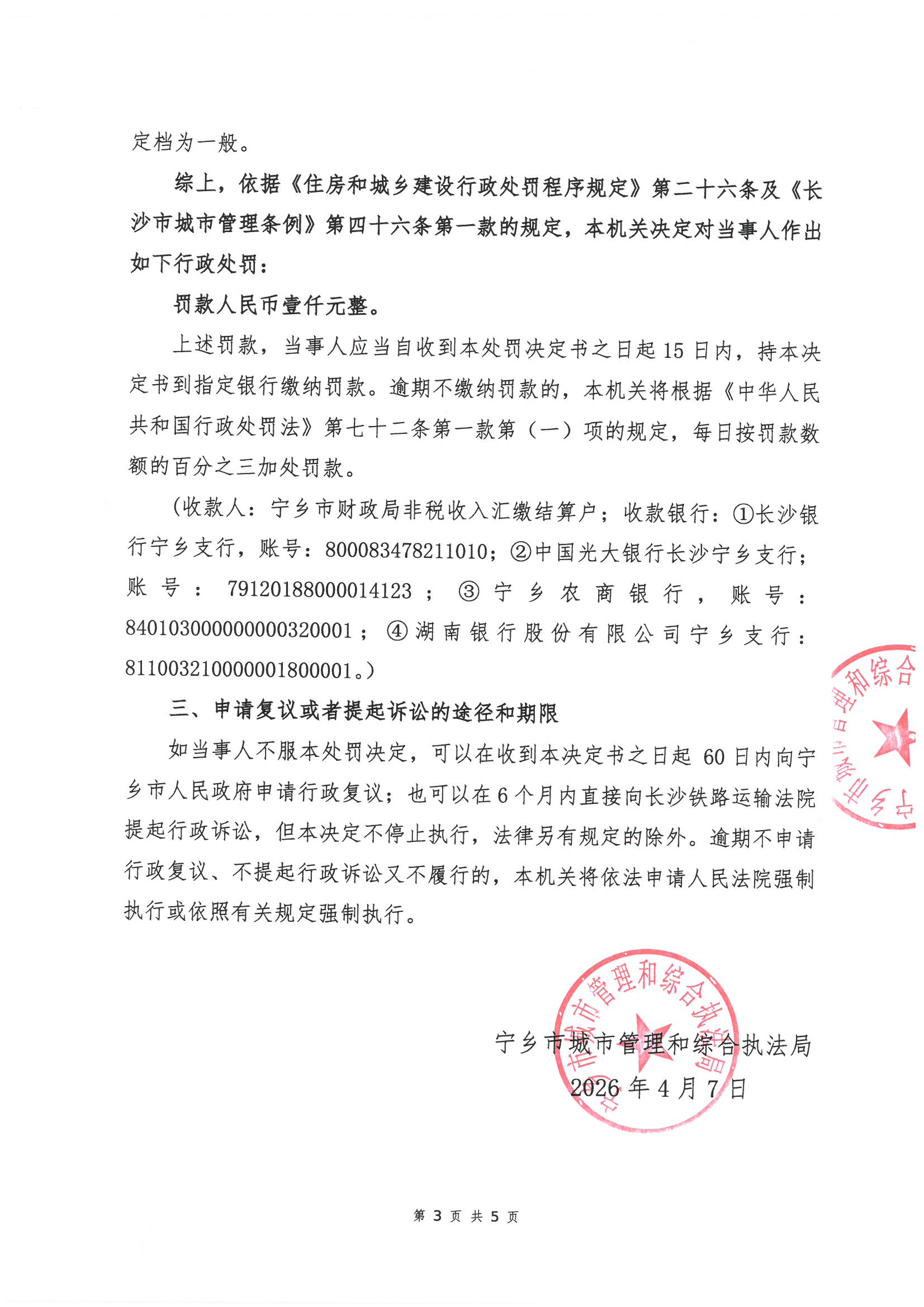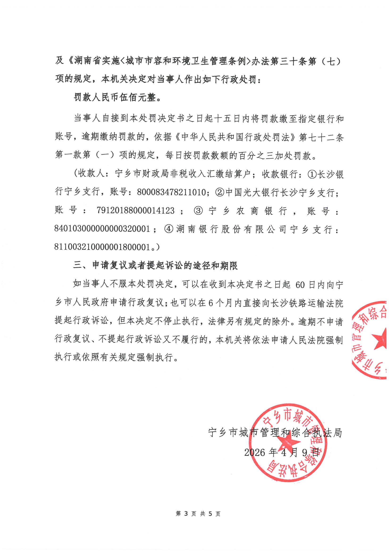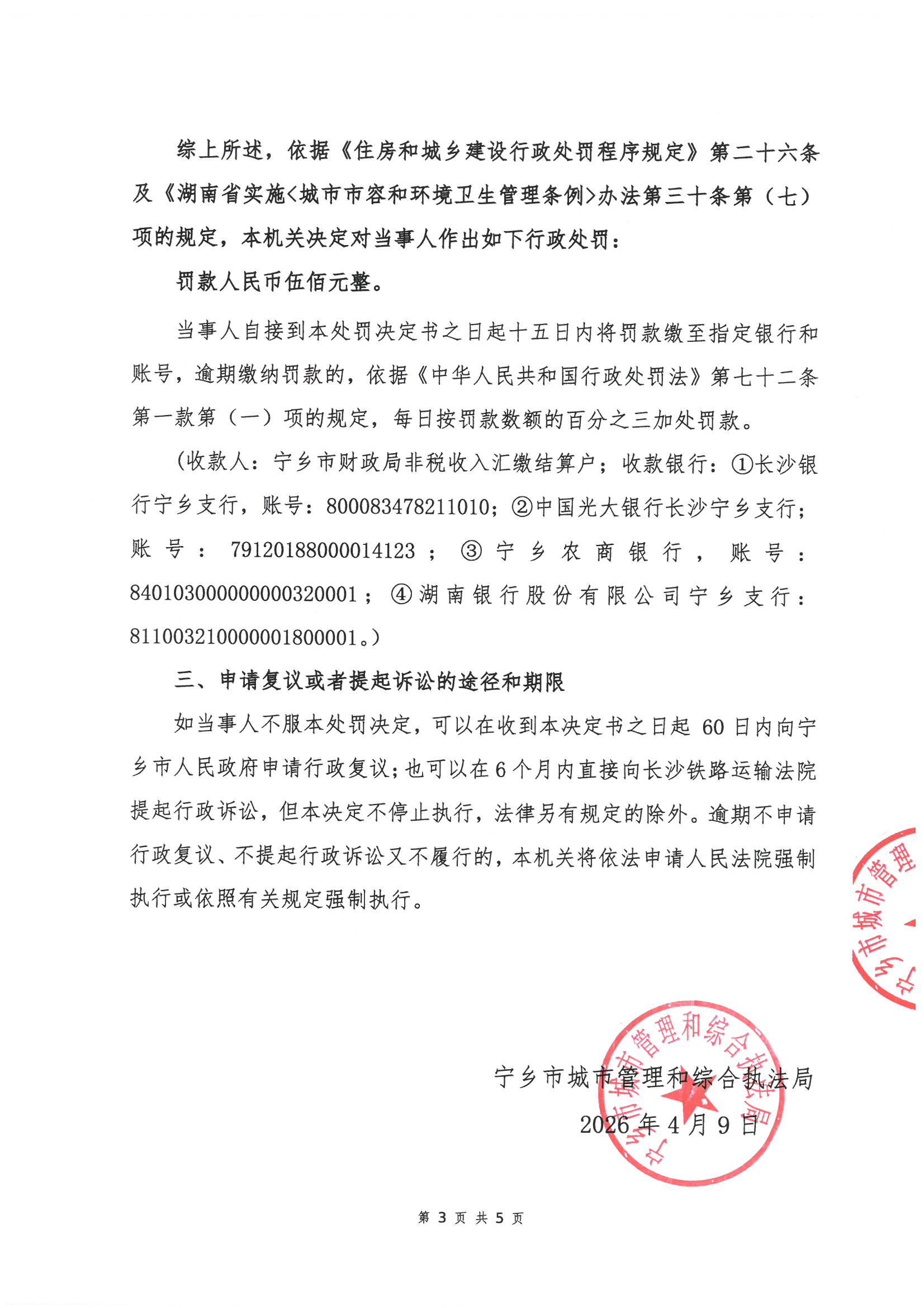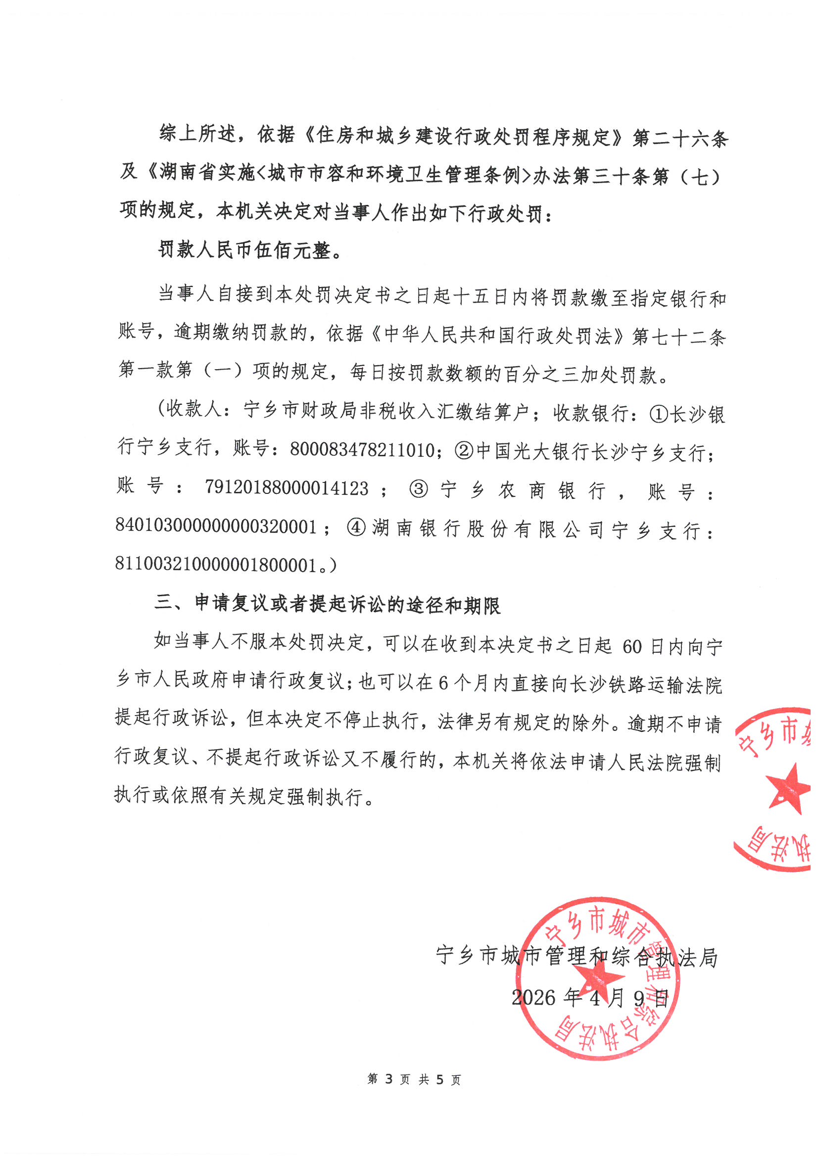 寧鄉市城市管理和綜合執法局行政處罰決定書公示