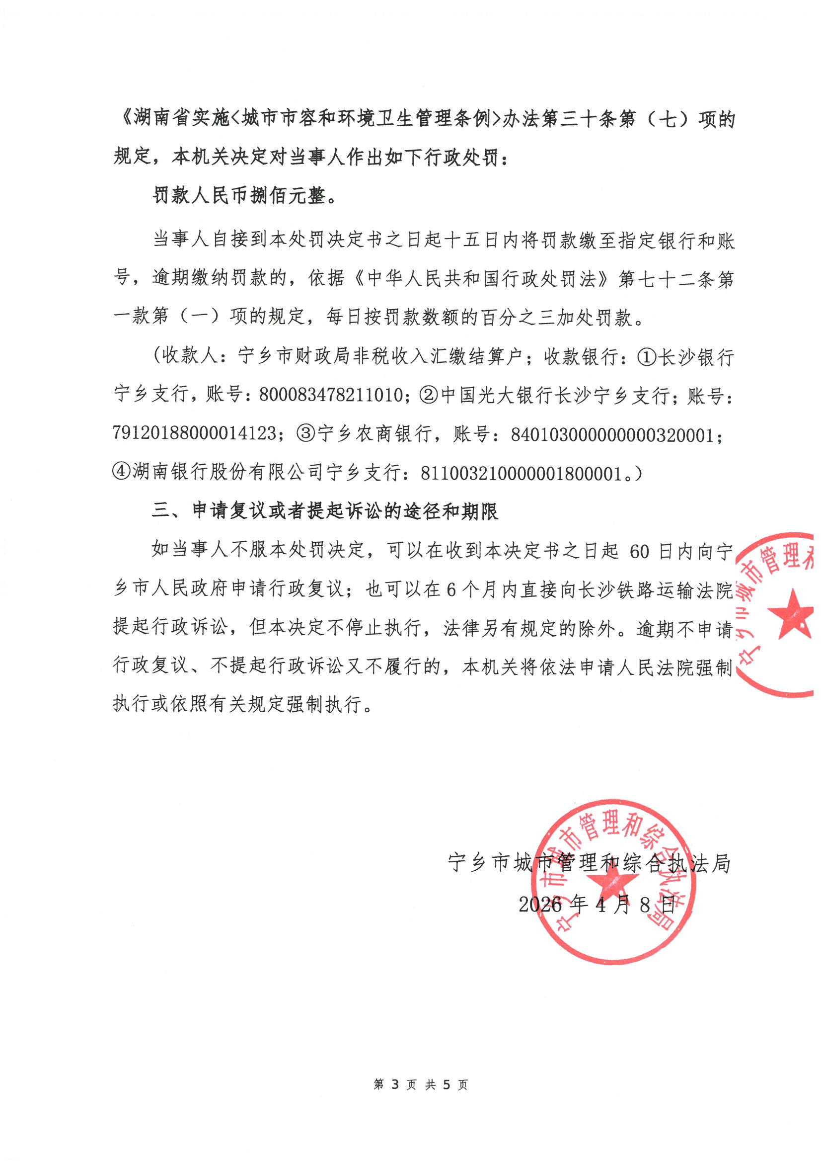 寧鄉市城市管理和綜合執法局行政處罰決定書公示