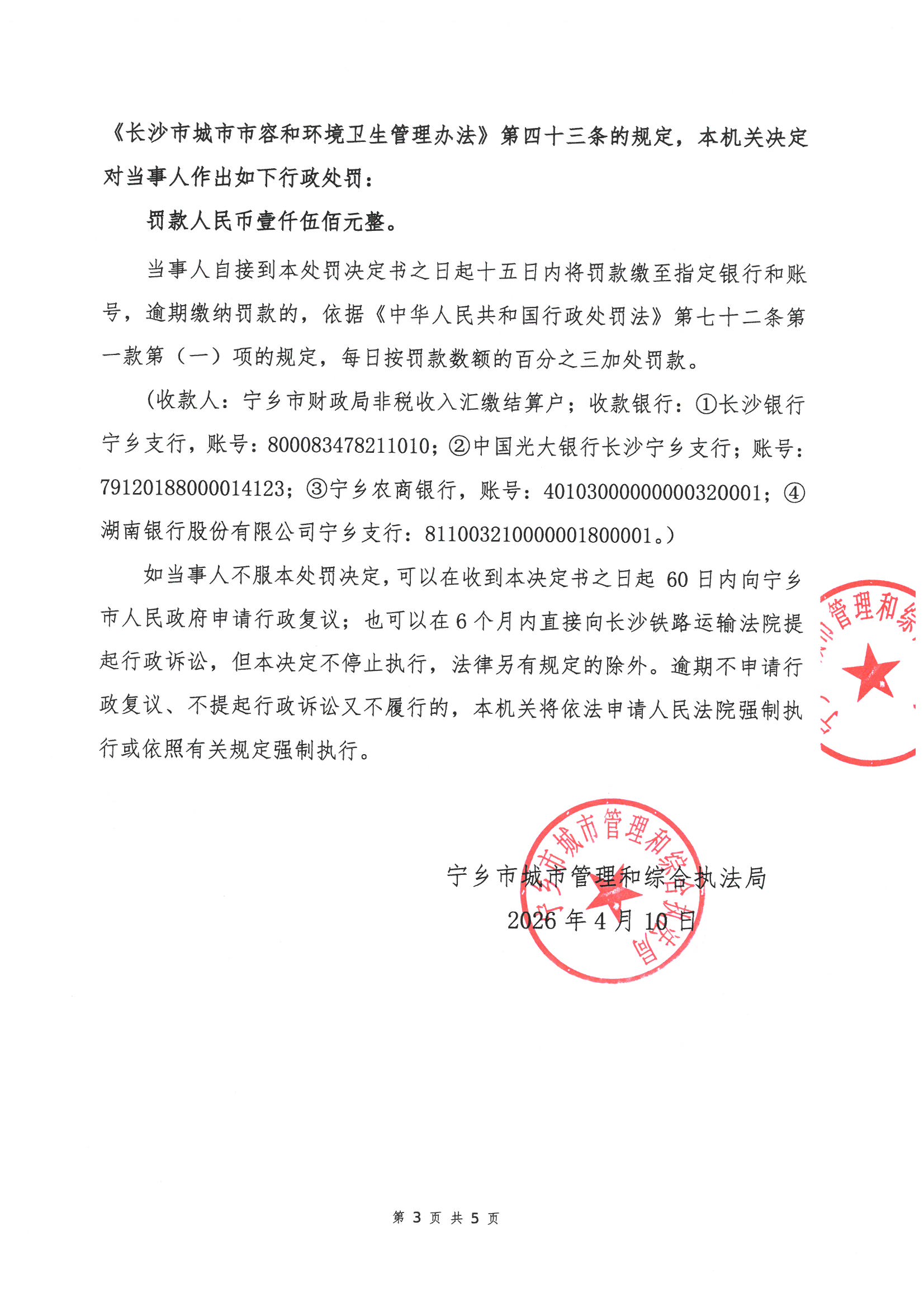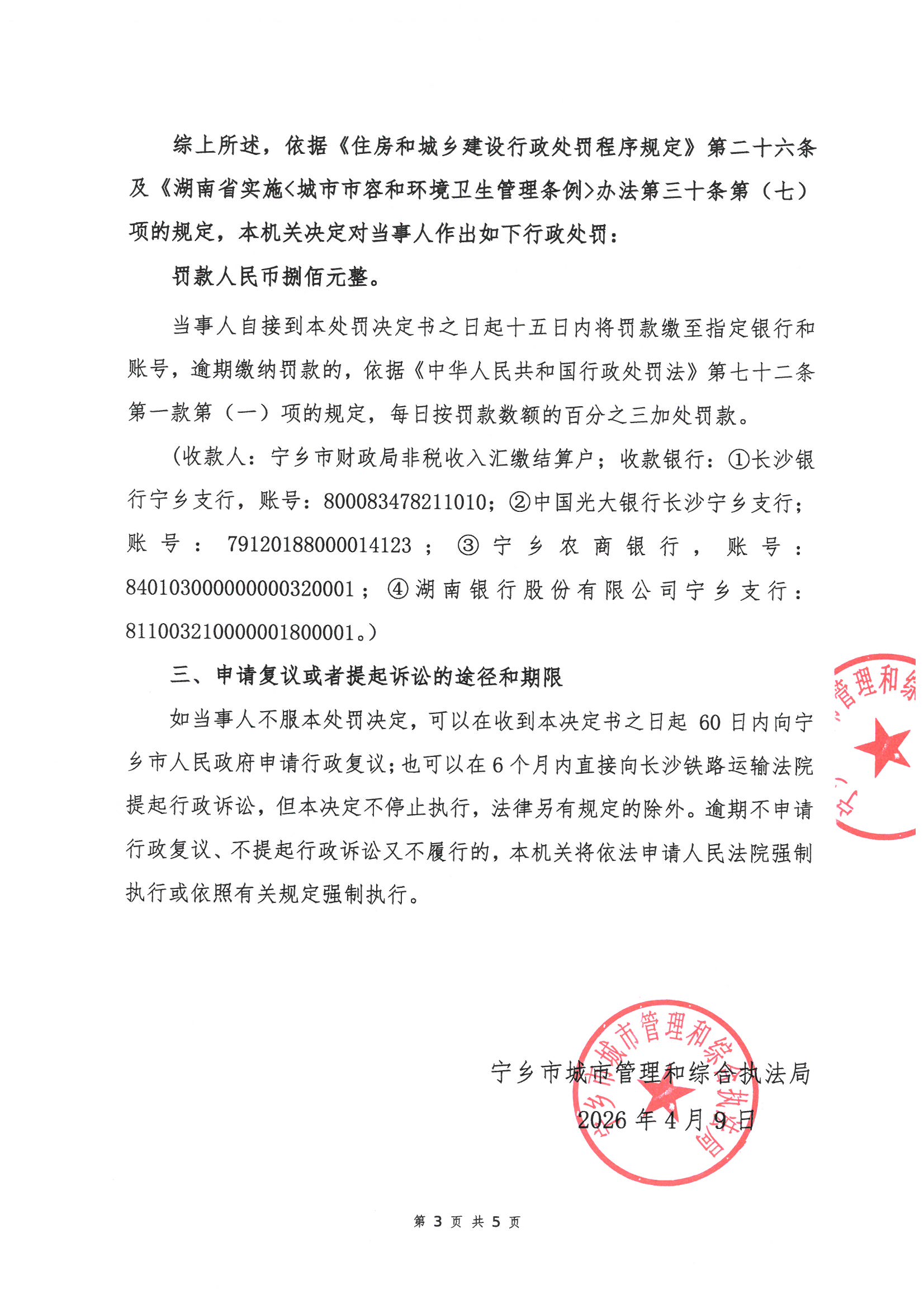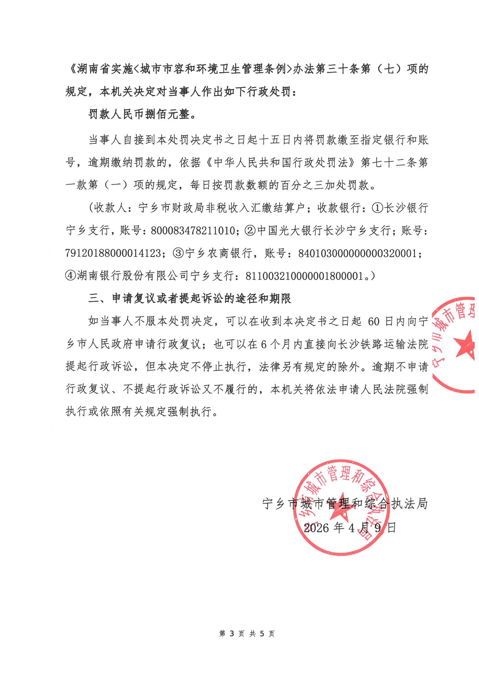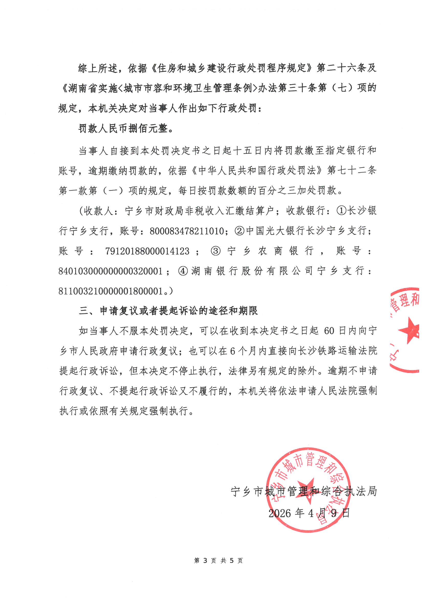 寧鄉市城市管理和綜合執法局行政處罰決定書公示