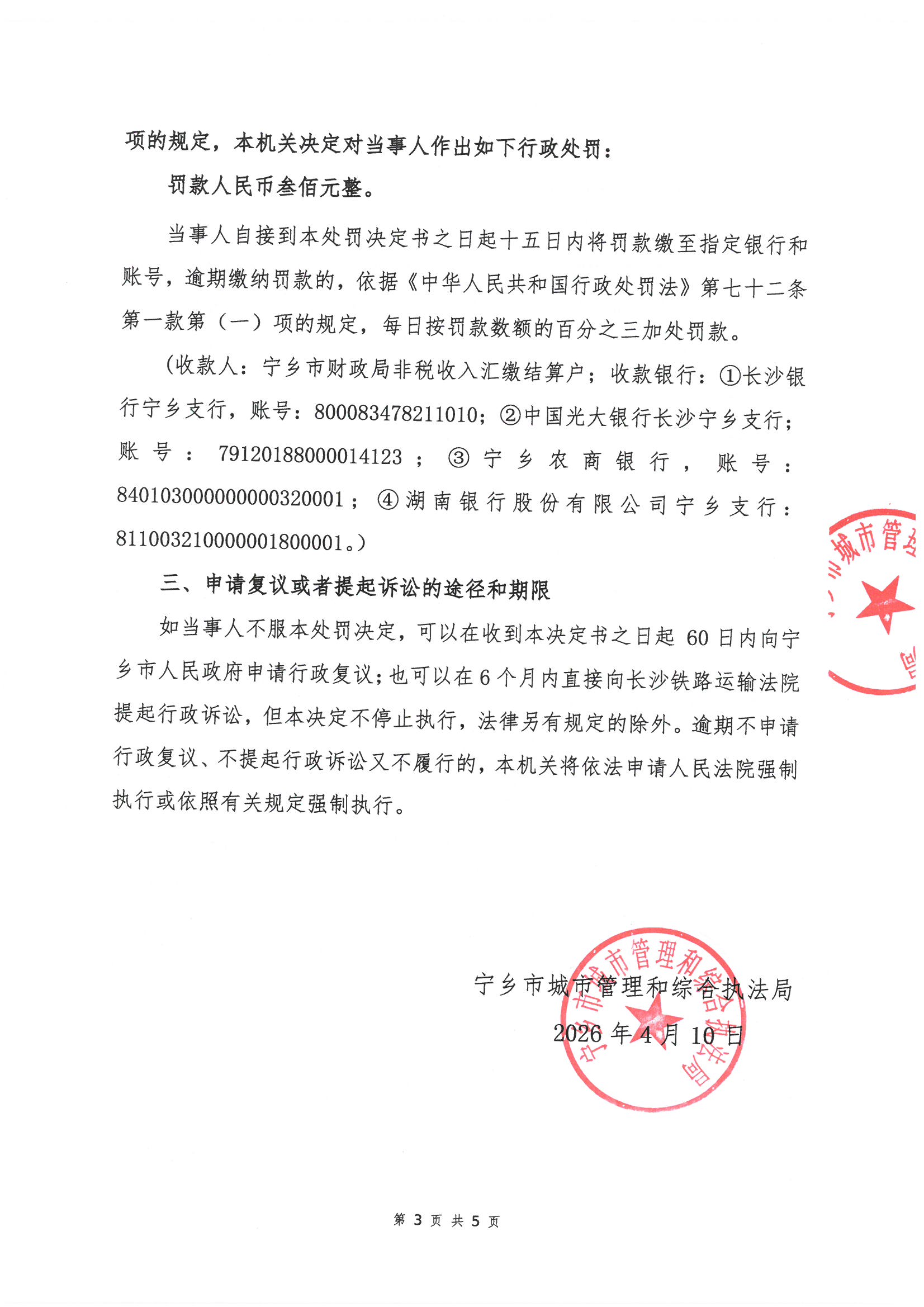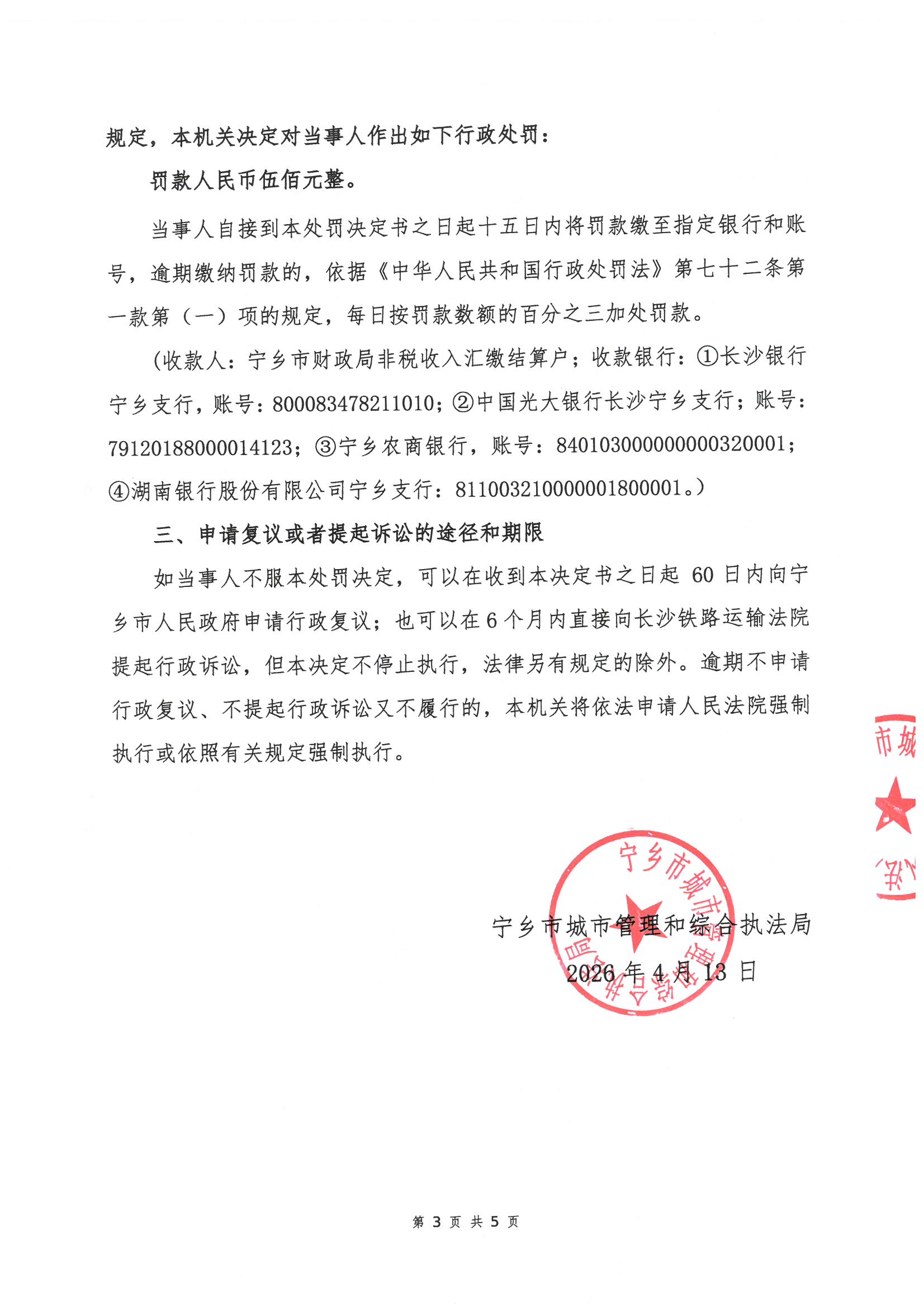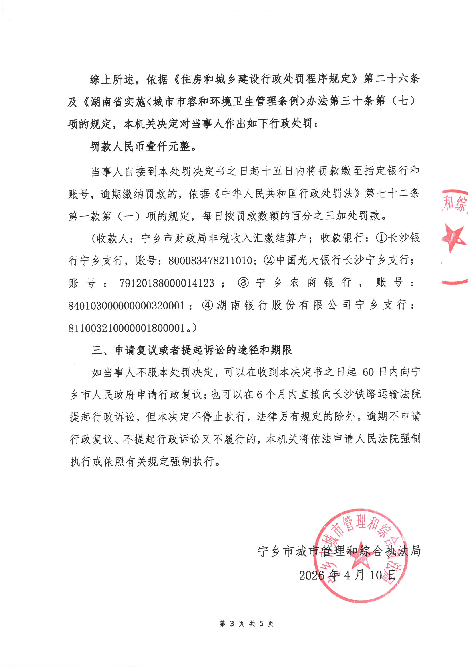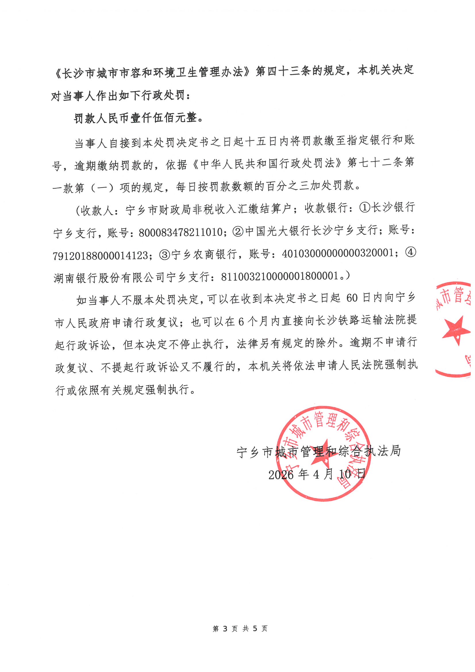 寧鄉市城市管理和綜合執法局行政處罰決定書公示