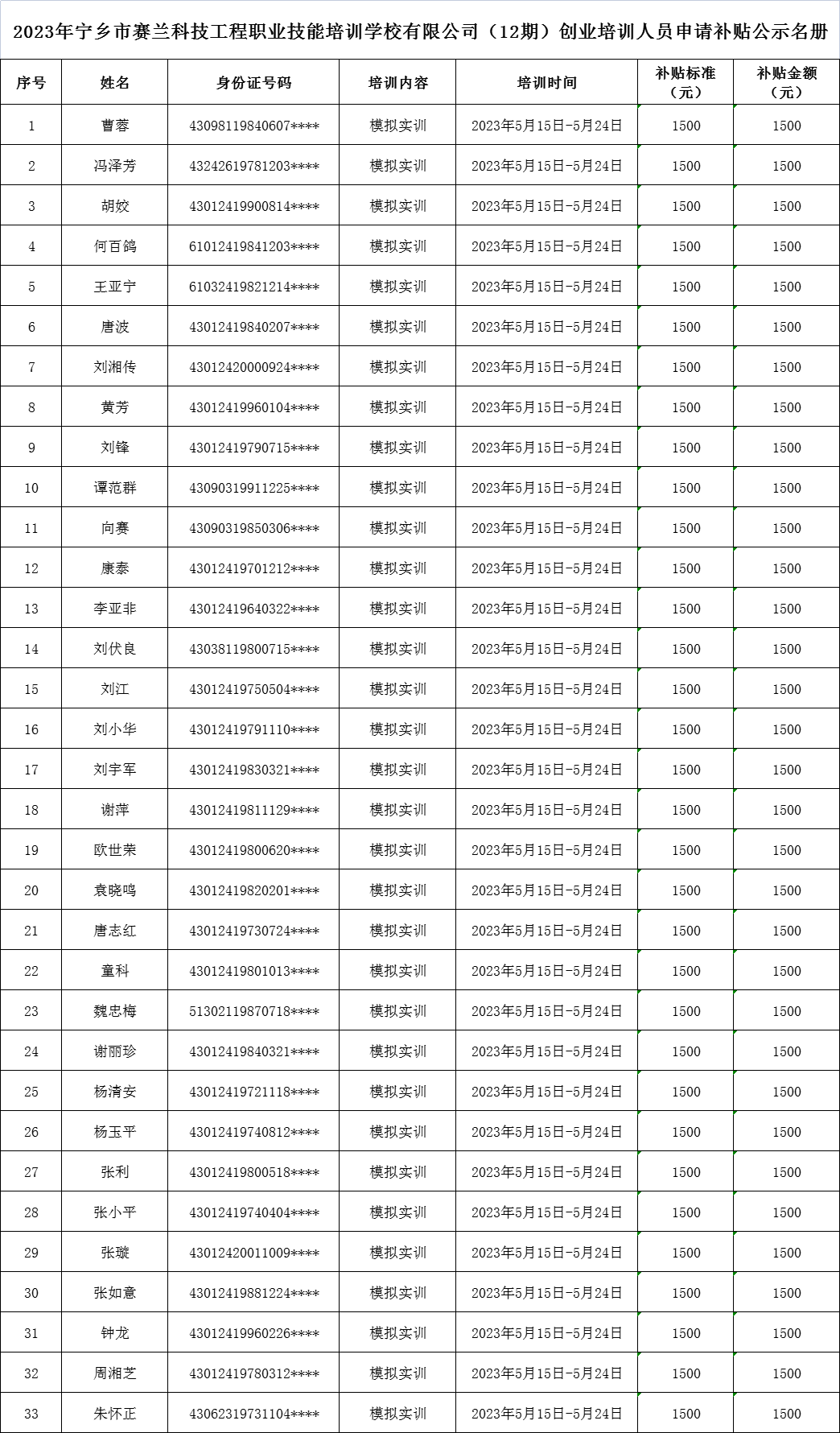 2023年寧鄉(xiāng)市賽蘭科技工程職業(yè)技能培訓(xùn)學(xué)校有限公司(12期)創(chuàng)業(yè)培訓(xùn)人員申請補(bǔ)貼公示名冊