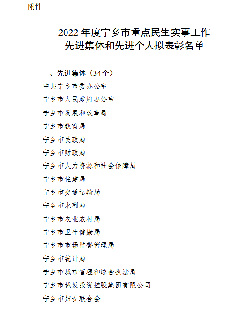 關于2022年度寧鄉市重點民生實事工作先進集體和先進個人擬表彰對象的公示