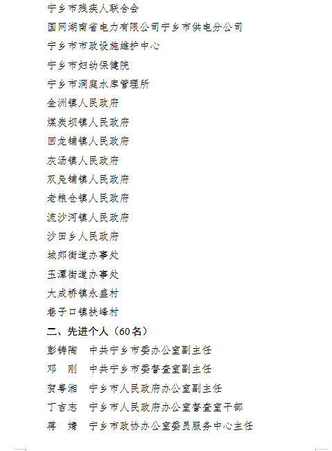 根據《寧鄉市重點民生實事工作先進集體和先進個人評選表彰方案》要求,經自下而上、逐級審核推薦,寧鄉市委、市政府擬表彰重點民生實事工作先進集體34個、先進個人60名。