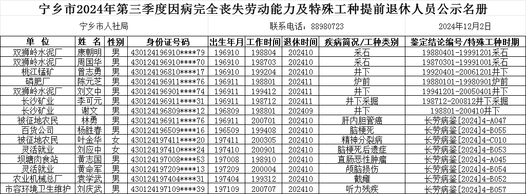 寧鄉市2024年第三季度因病完全喪失勞動能力及特殊工種提前退休人員公示名冊