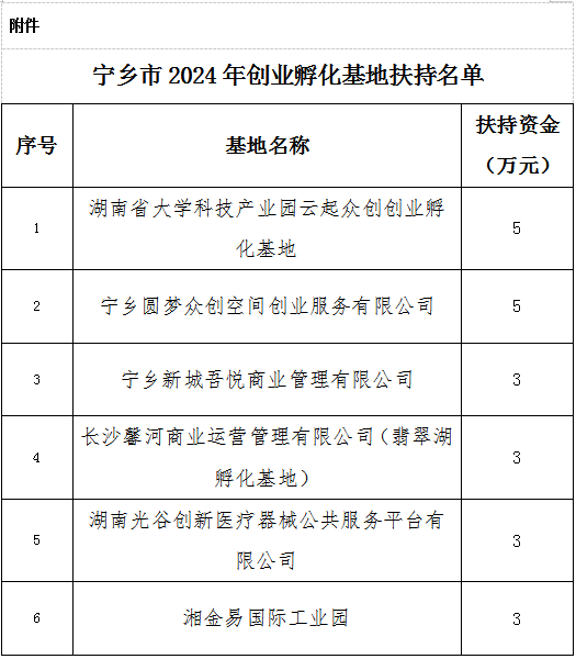 寧鄉市2024年創業孵化基地 扶持名單公示