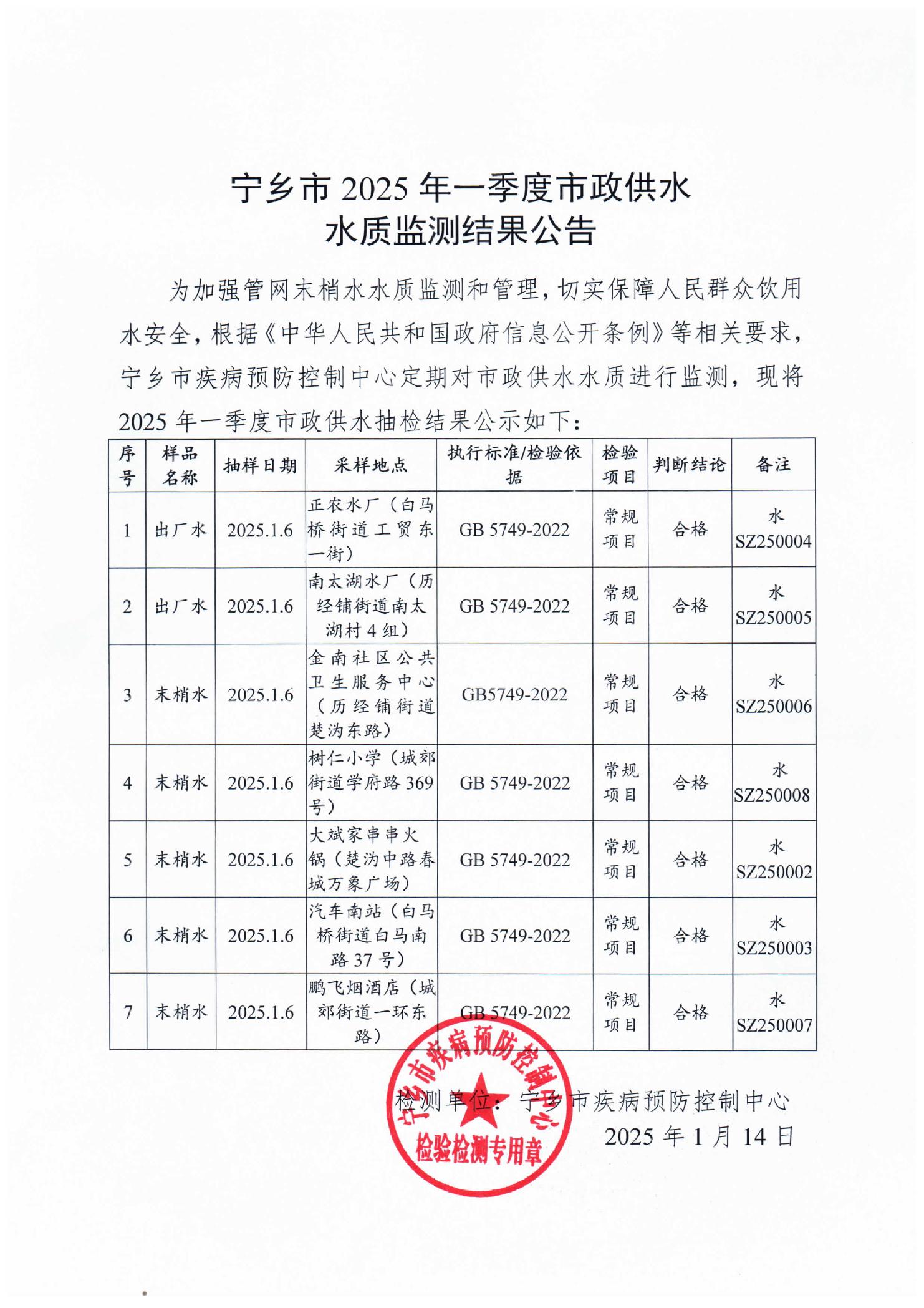 寧鄉(xiāng)市2025年一季度市政供水水質(zhì)監(jiān)測結(jié)果公告
