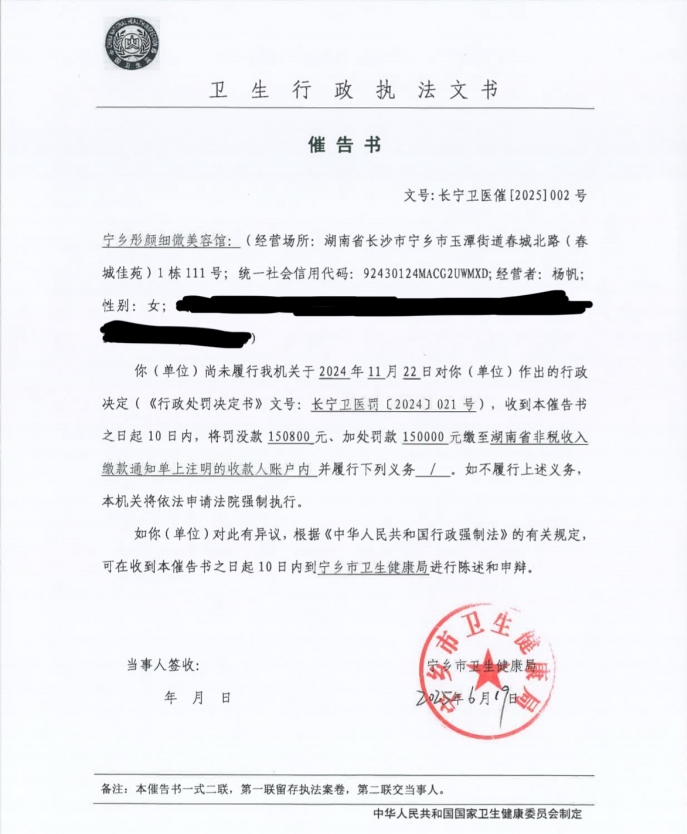????你(單位)尚未履行2024年11月22日我機(jī)關(guān)對(duì)你(單位)作出的行政處罰(《行政處罰決定書(shū)》文號(hào):長(zhǎng)寧衛(wèi)醫(yī)罰〔2024〕021號(hào)),依據(jù)《中華人民共和國(guó)行政強(qiáng)制法》第三十五條和第五十四條等規(guī)定,本機(jī)關(guān)發(fā)出《催告書(shū)》(長(zhǎng)寧衛(wèi)醫(yī)催〔2025〕002號(hào)),因其他法定方式無(wú)法送達(dá),現(xiàn)依法向你(單位)公告送達(dá)《催告書(shū)》(長(zhǎng)寧衛(wèi)醫(yī)催〔2025〕002號(hào)),文書(shū)內(nèi)容見(jiàn)附件,自公告之日起經(jīng)過(guò)30日,即視為送達(dá)。