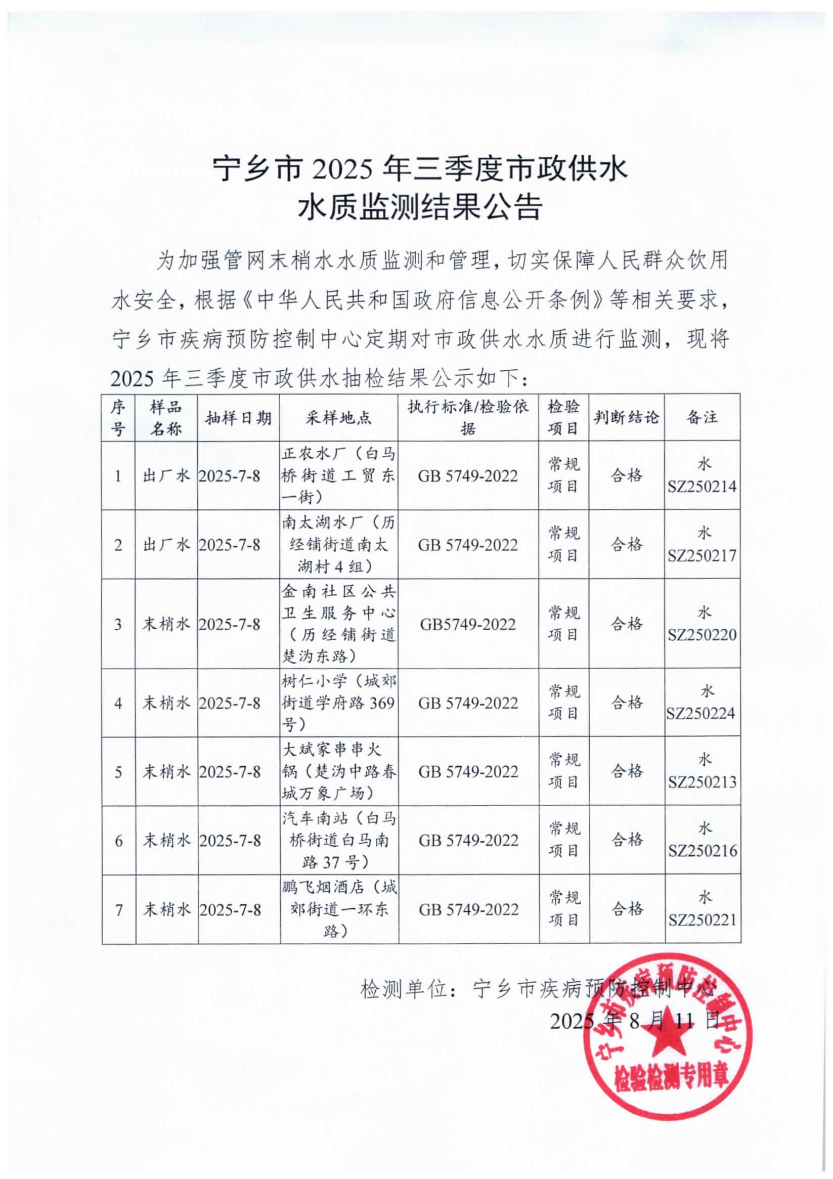 寧鄉市2025年三季度市政供水水質監測結果公示