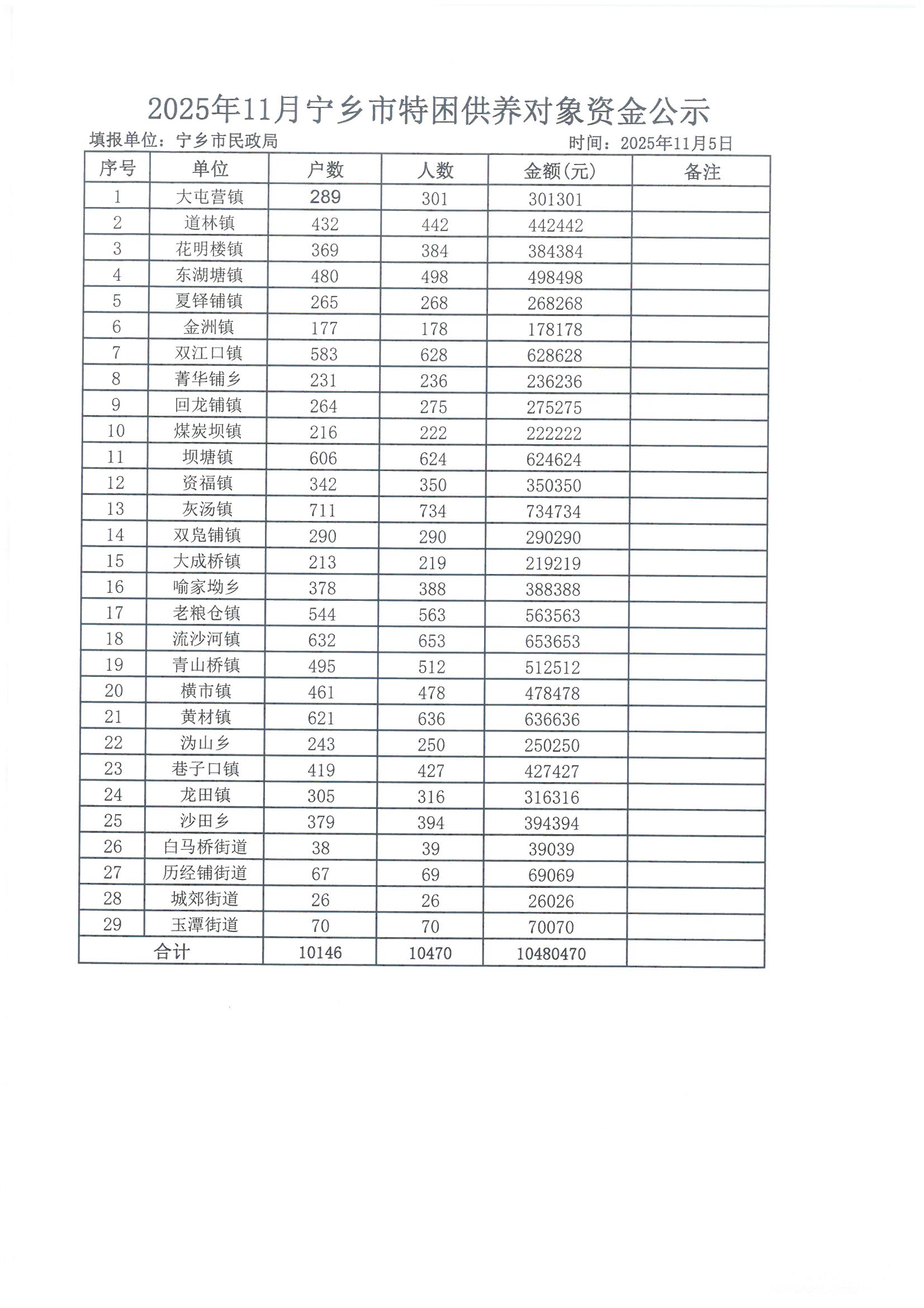 2025年11月寧鄉市特困供養對象資金公示