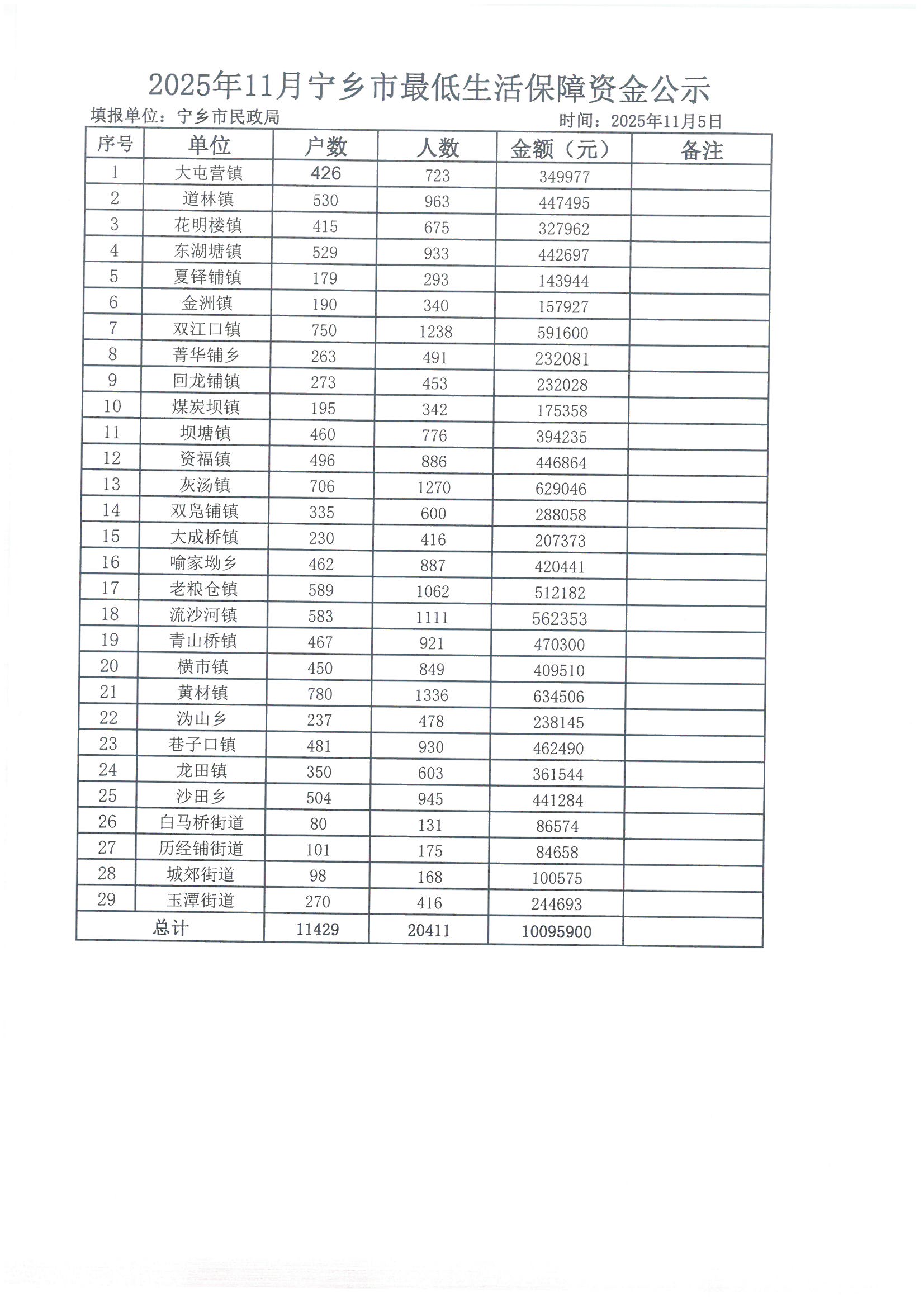 2025年11月寧鄉市最低生活保障資金公示