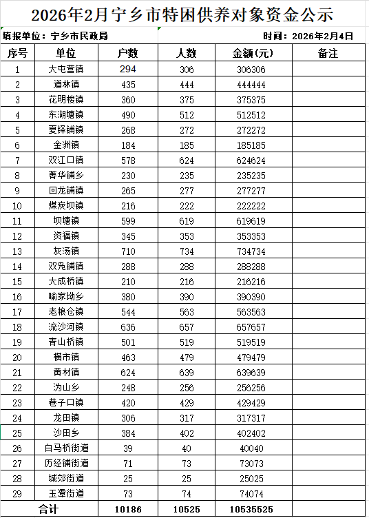 2026年2月寧鄉市特困供養對象資金公示