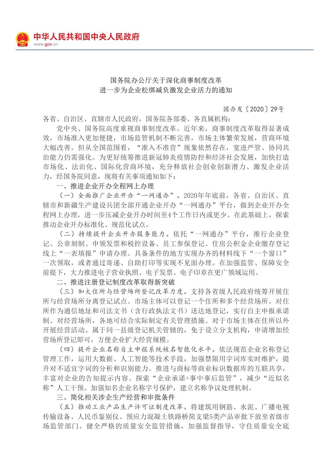國務院辦公廳關于深化商事制度改革進一步為企業松綁減負激發企業活力的通知