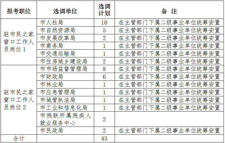為加強市民之家行政審批服務窗口人員隊伍建設(shè),根據(jù)《事業(yè)單位人事管理條例》等規(guī)定,經(jīng)市委、市政府同意,決定面向?qū)庎l(xiāng)市內(nèi)市直和街道差額、自籌人員擇優(yōu)選調(diào)43名全額事業(yè)工作人員?,F(xiàn)將有關(guān)事項公告如下: