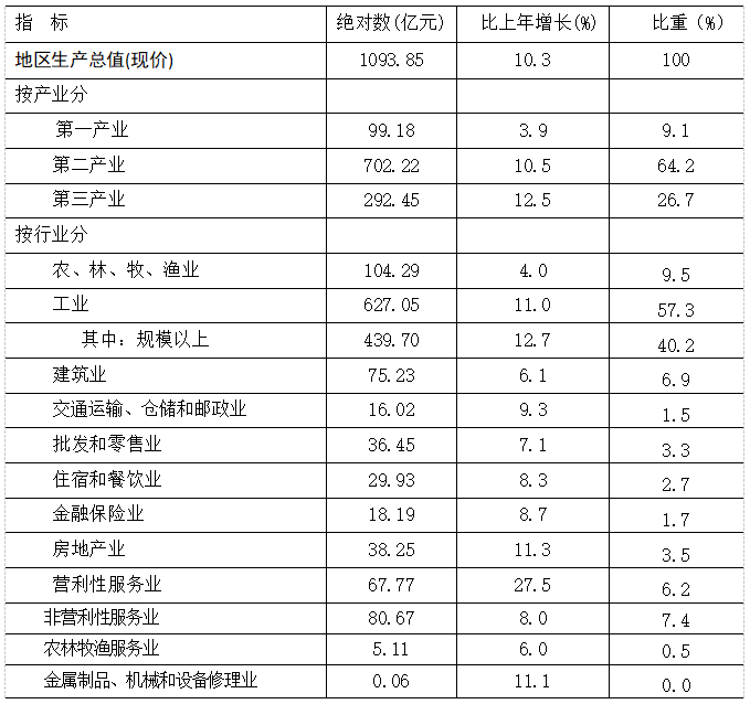 全市三次產業結構由上年的10.9:66.2:22.9調整為9.1∶64.2∶26.7,工業增加值占GDP的比重為57.3%。第一、二、三產業對經濟增長的貢獻率為3.4%、66.9%、29.7%,分別拉動GDP增長0.4、6.9、3.1個百分點。