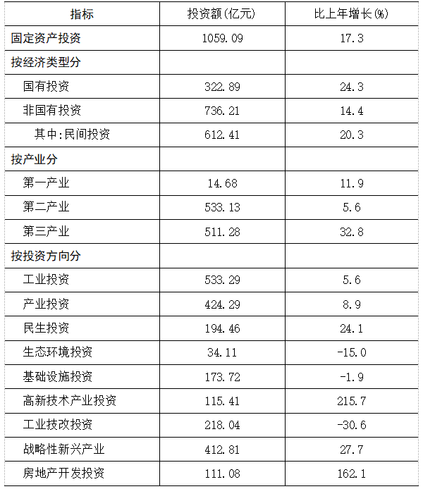 固定資產投資:全年完成固定資產投資1059.09億元,比上年增長17.3%。本年完成投資超過5000萬元的在建項目209個,全年完成投資584.13億元,占全社會投資總額的55.2%。