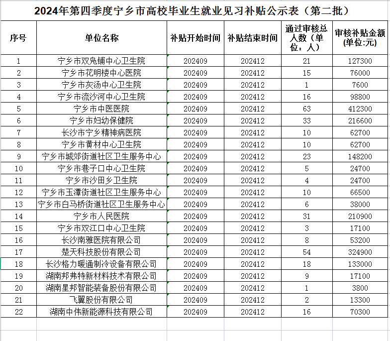 關(guān)于2024年第四季度(9、10、11、12月)寧鄉(xiāng)市高校畢業(yè)生就業(yè)見習補貼(第二批)情況的公示